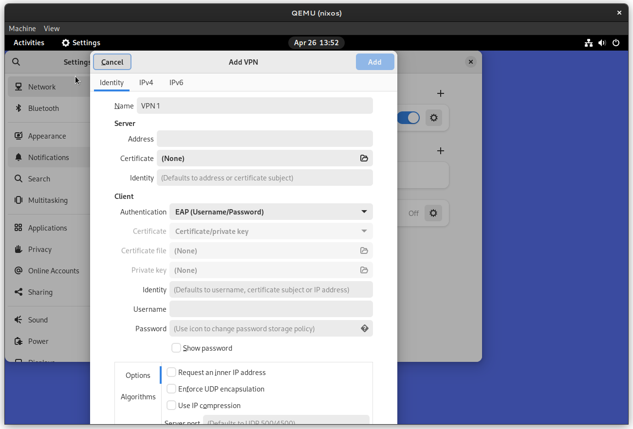 Can confirm the editor can be displayed on NixOS in GNOME Control Center 42.0 with networkmanager-strongswan built from that branch: Have not tested actual connection as I do not have the VPN server but clicking through the UI I have not noticed any warnings in terminal or issues other than the dialogue being too tall to fit on the 1280×800 screen of my virtual machine, and the input fields not having any visible outline. But those issues are present in other VPN providers (e.g. OpenConnect) too so perhaps it is a bug in GNOME Control Center. |