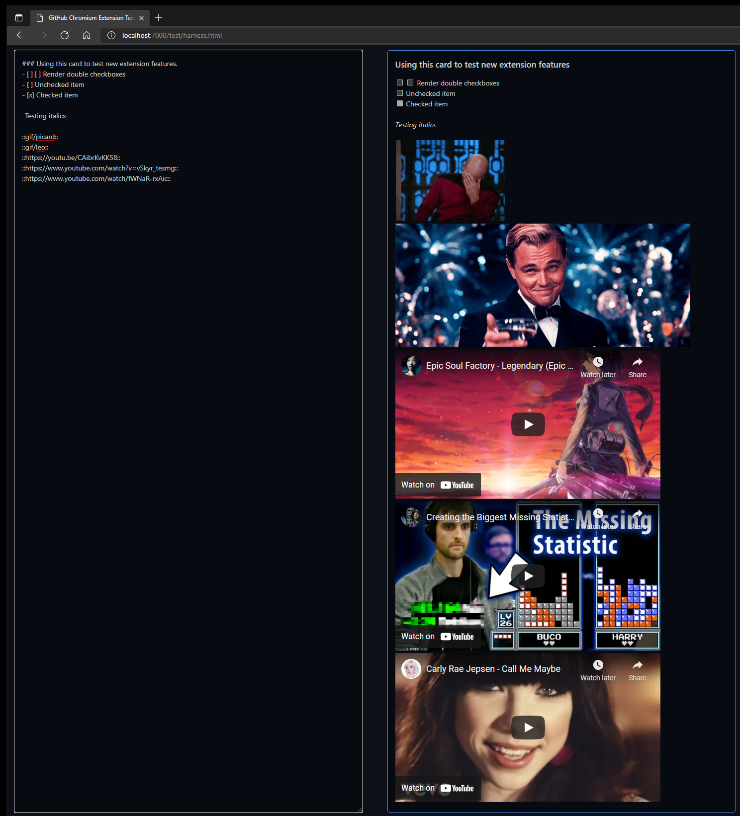 Eventually, I'll serve this testbed as a static HTML page that anyone can play with, just to see the new features that the extension offers for enhancing GitHub issue markdown.