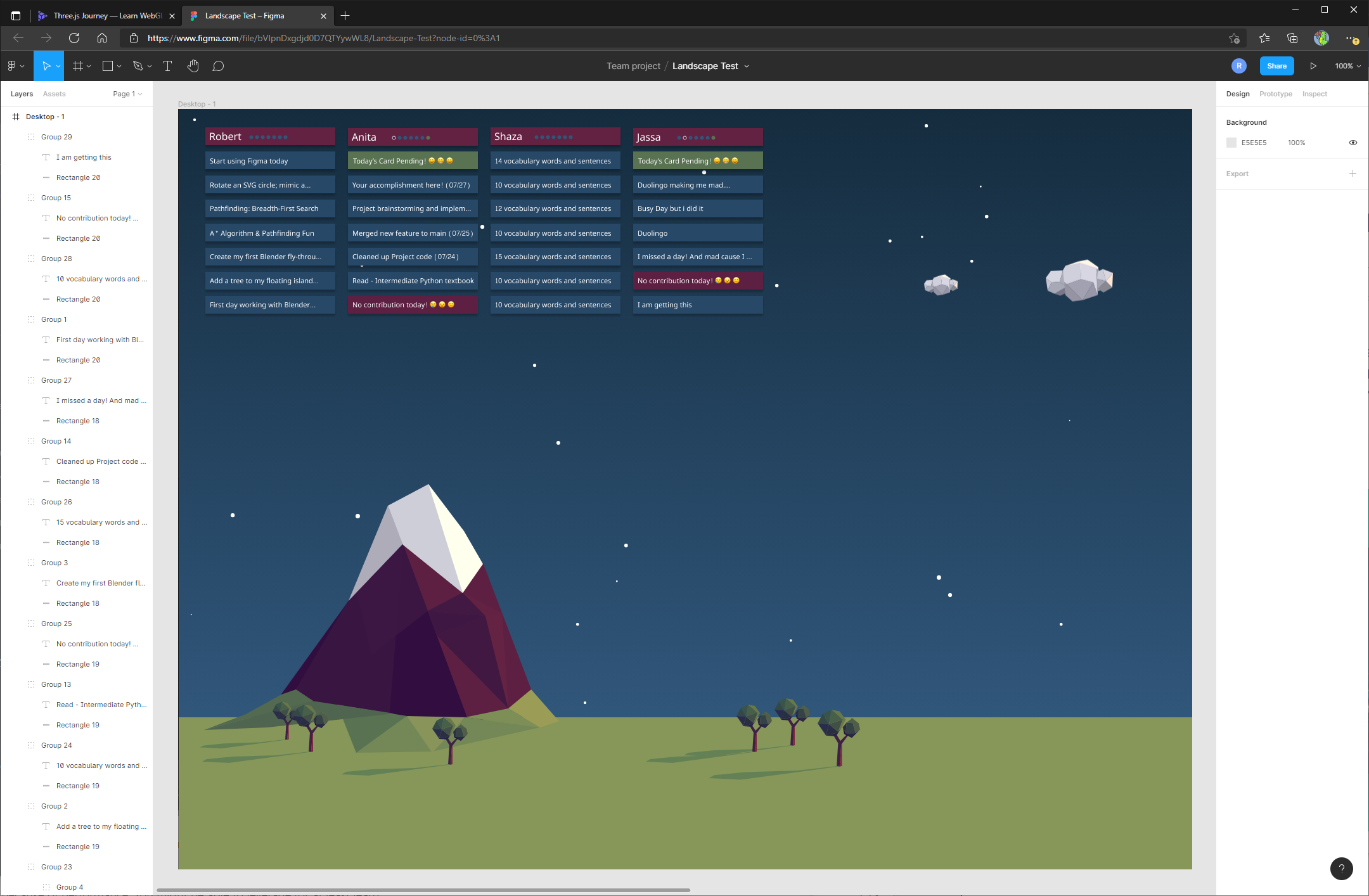 My project is similar to Amelia's (I think) but the number of CSS poly-art trees/huts/clouds/mountains are generated by the cards you create! 🥳 And over time, you'll work together with your study group (up to four people, max) to create a scene. And the scene changes every month. (This idea was also inspired by the different cool Windows 10 lock screens I see every morning!) We work hard every day to contribute our cards-- the least we can get is a nice visualization! 🎉