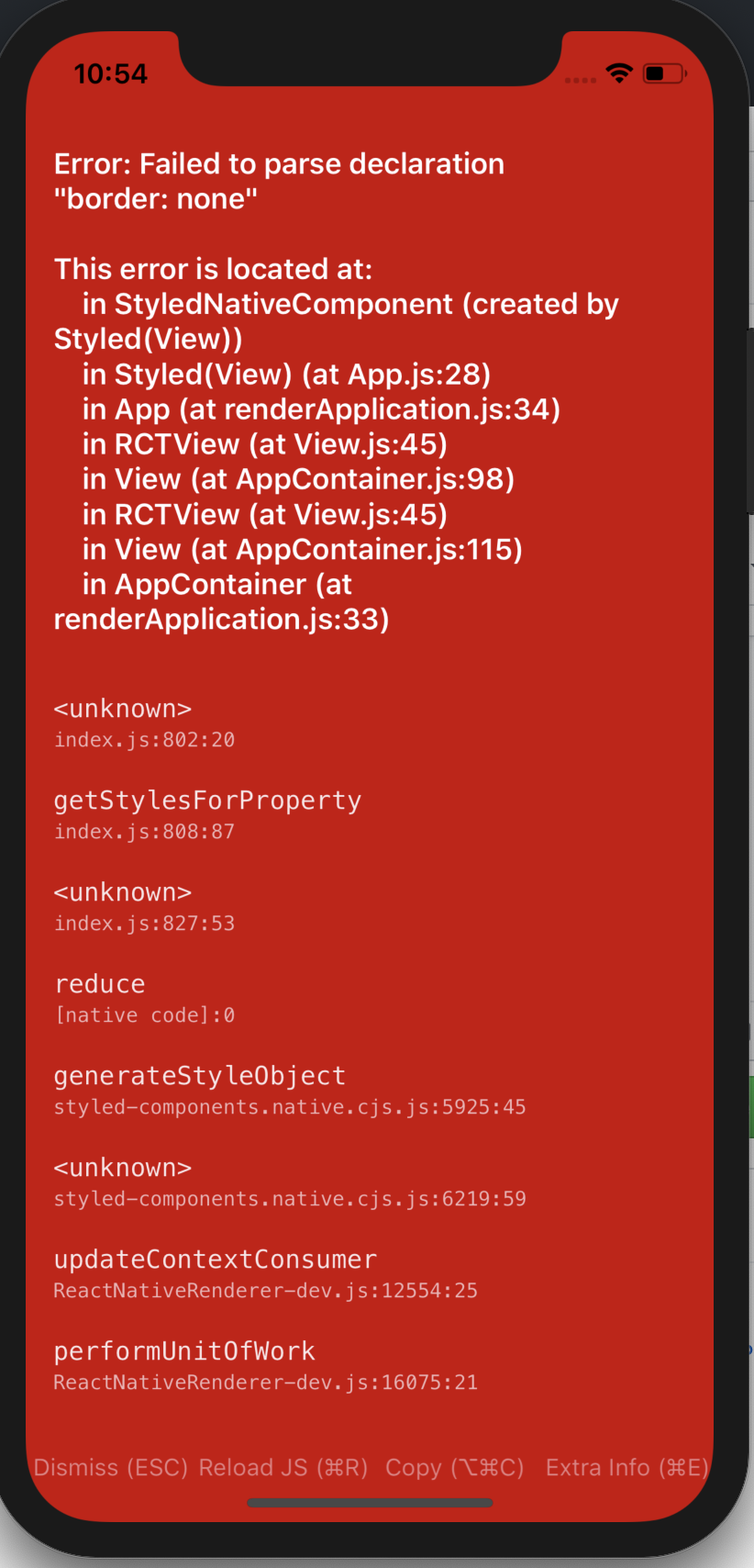 **Error** `Error: Failed to parse declaration "border: none"`  **Test repo** https://github.com/romainbraun/rn59-border-none-regression **Steps** - Create new react native project - Add styled-components - Use a styled view with the `border: none` property - Run the app **Expected behaviour** The view has no border **Actual Behaviour** The app errors **Notes** - Using `border: 0;` works fine. - Tested it with RN 0.57.8, 0.58, 0.59, and styled-components 4.2, 3.4.5 IIRC