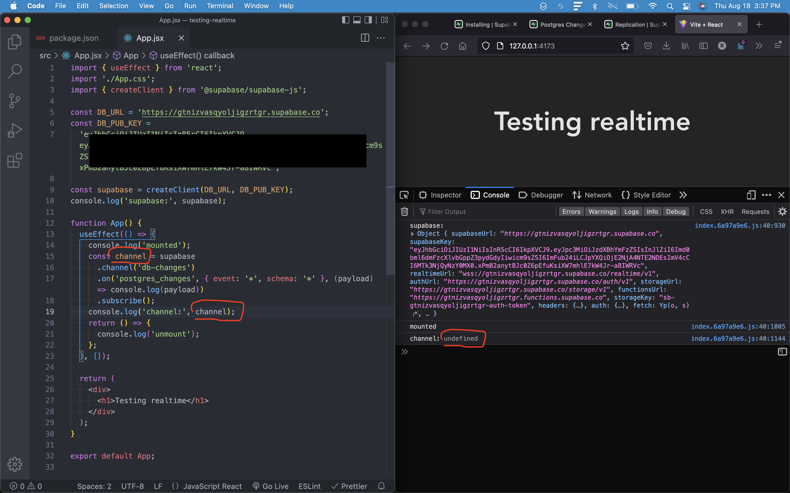 Using the new supabase-js 2.0.0-rc.3, and following the guide exactly, the channel is left undefined AND no payload is ever delivered when the I insert/update a row in the DB.