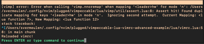 This is because we have already defined a map for <leader>hw above this line. Note that this error will not stop the rest of our config from loading. By default, Vimpeccable will simply log the error and continue, to ensure as much as your config can be loaded as possible.