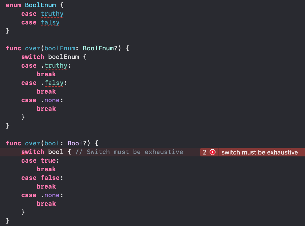 switching over an optional boolean withtrueandfalseliterals, an error diagnostic is produced claiming that the switch statement is not exhaustive. This is inconsistent with other pattern matchable value types which unwraps the optional to perform a match.Steps To Reproduce