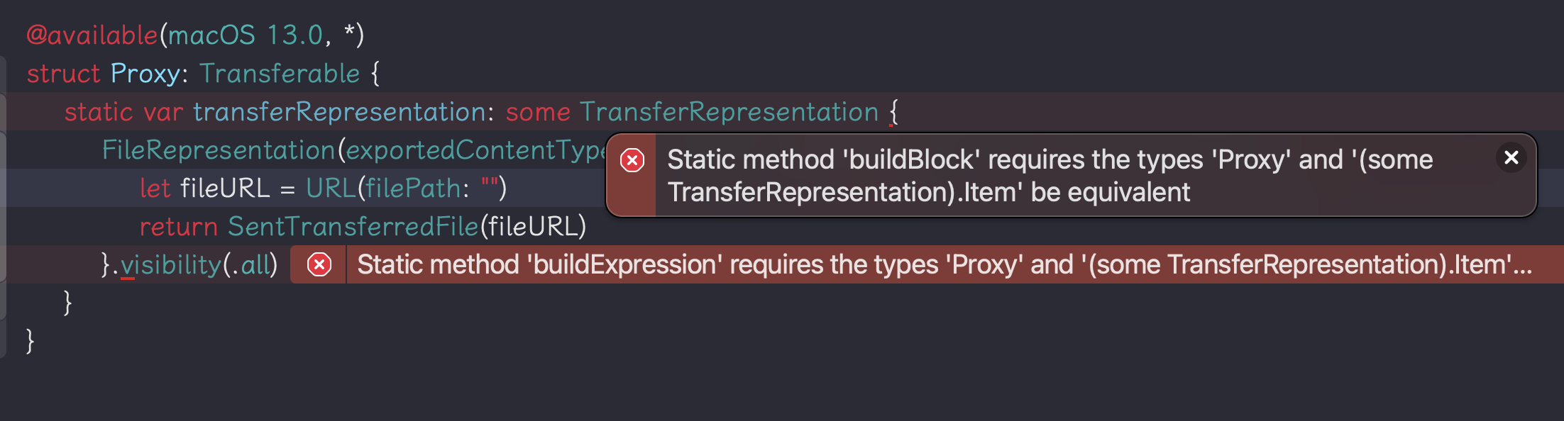 let fileRepresentation = FileRepresentation(exportedContentType: .mpeg4Movie) { (item: Proxy) -> SentTransferredFile in