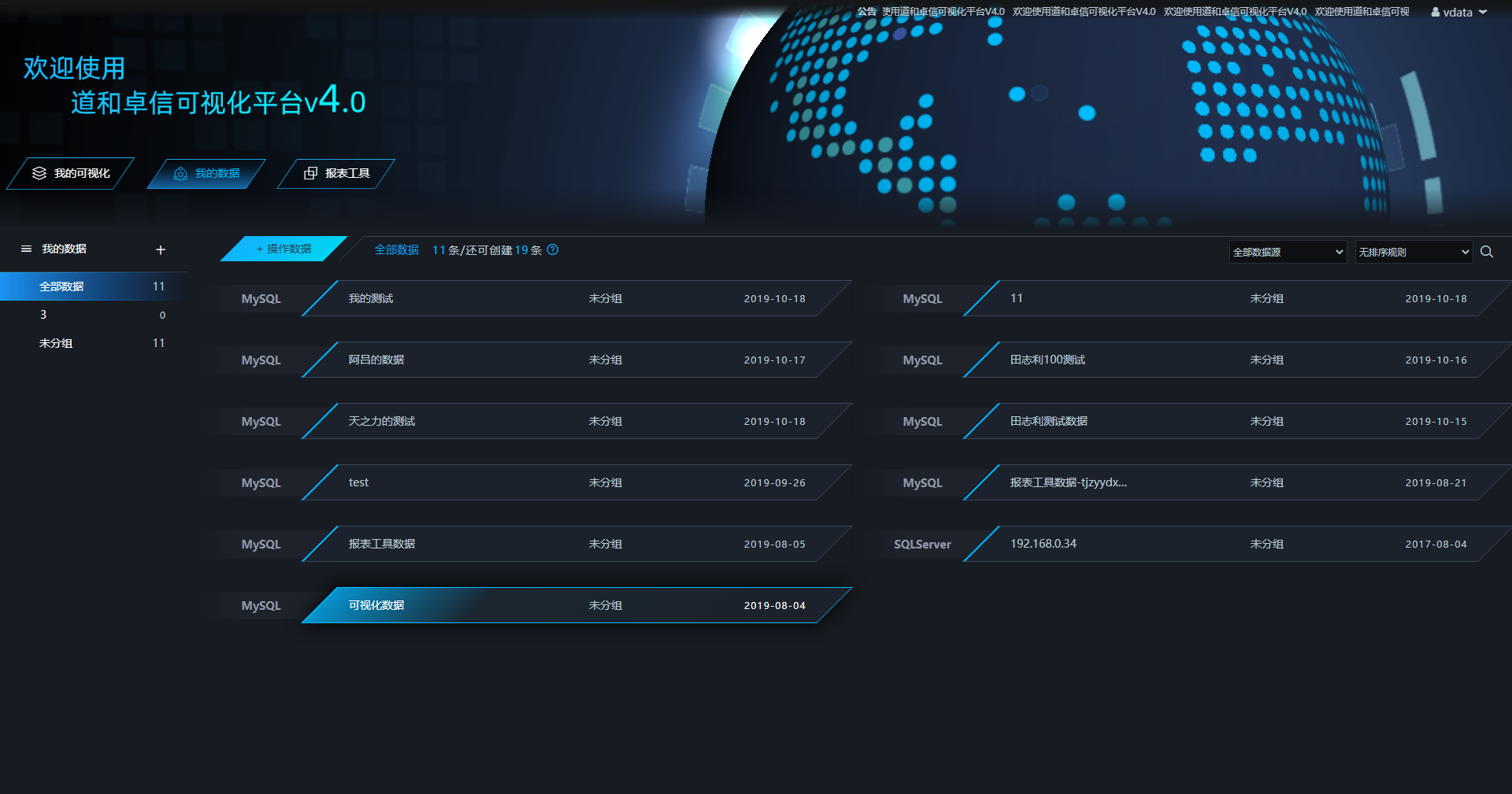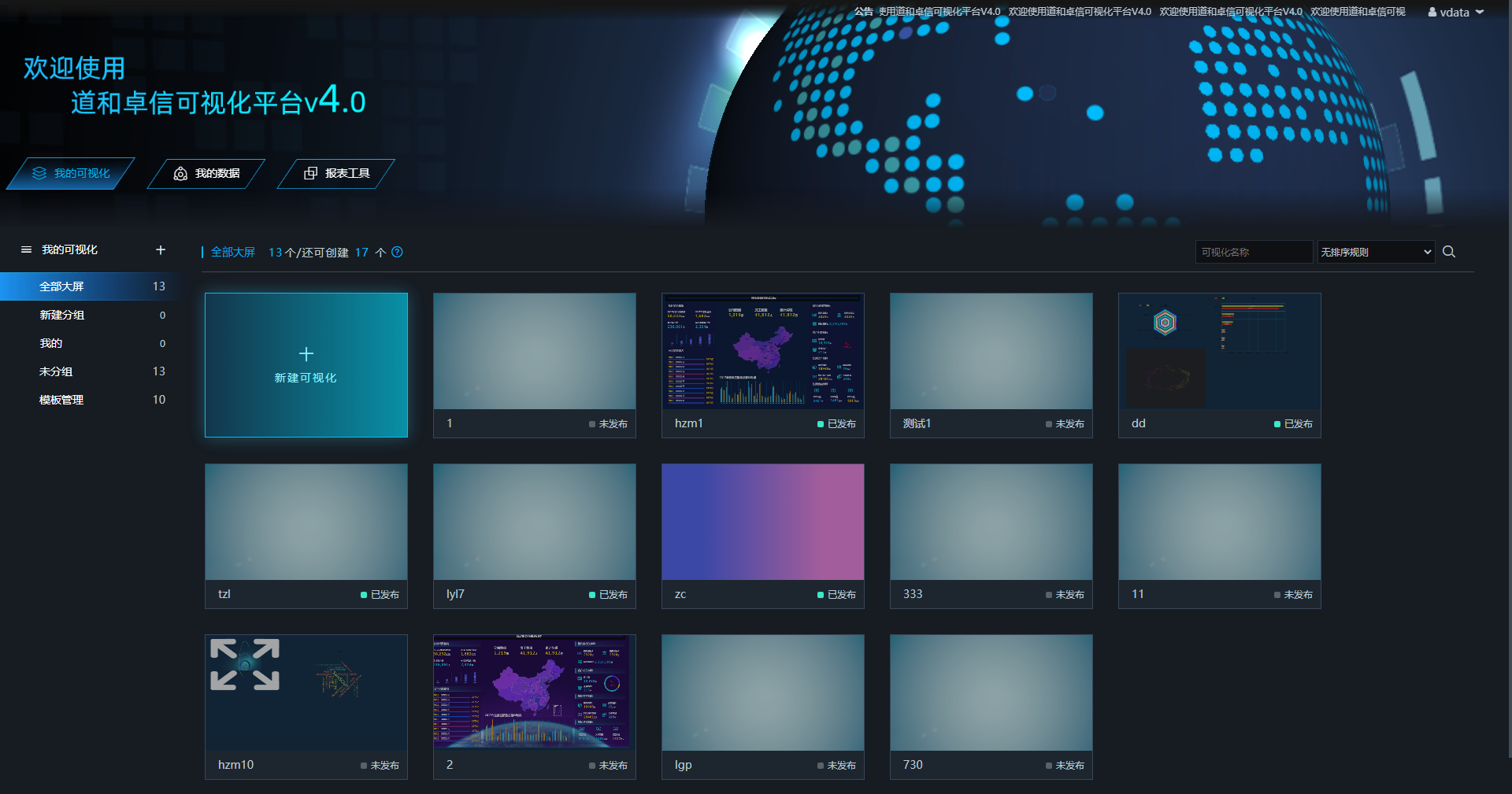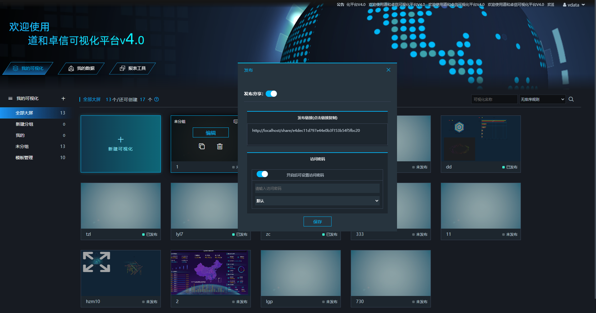 visualization 可视化项目主要功能是让用户能够创建自己的可视化页面,在页面中用户可以创建各种echarts图表,各种动画效果,还可以引入页面等等,此外还可以 echarts图表跟自己的数据库的数据相关联,将数据通过图表表现出来。还有报表工具将数据库的数据通过报表展示出来。 主页面: 主页面为数据的展示:包括可视化、连接数据库的数据以及报表数据,除此之外还可以分享可视化页面。 创建大屏 通过主页面可以创建大屏 可视化设计页面 主要包括了常见的Echarts图表,还有一些特殊动画效果图,右边可以编辑页面和图表的一些属性。 可视化展示 报表设计页面 主要是通过sql语句再结合报表工具设计成excel展示