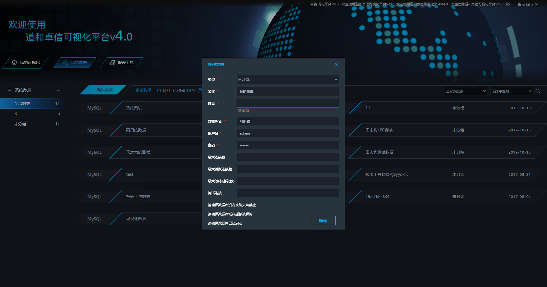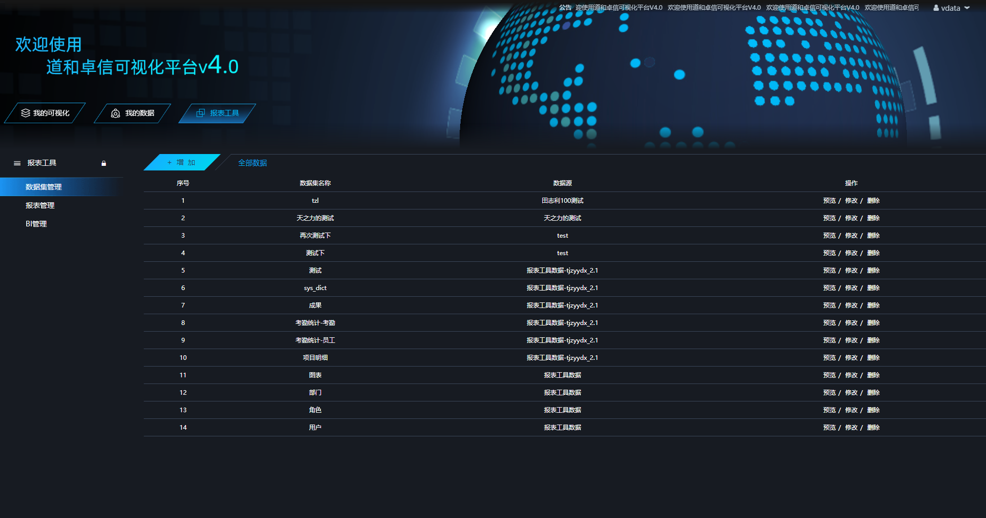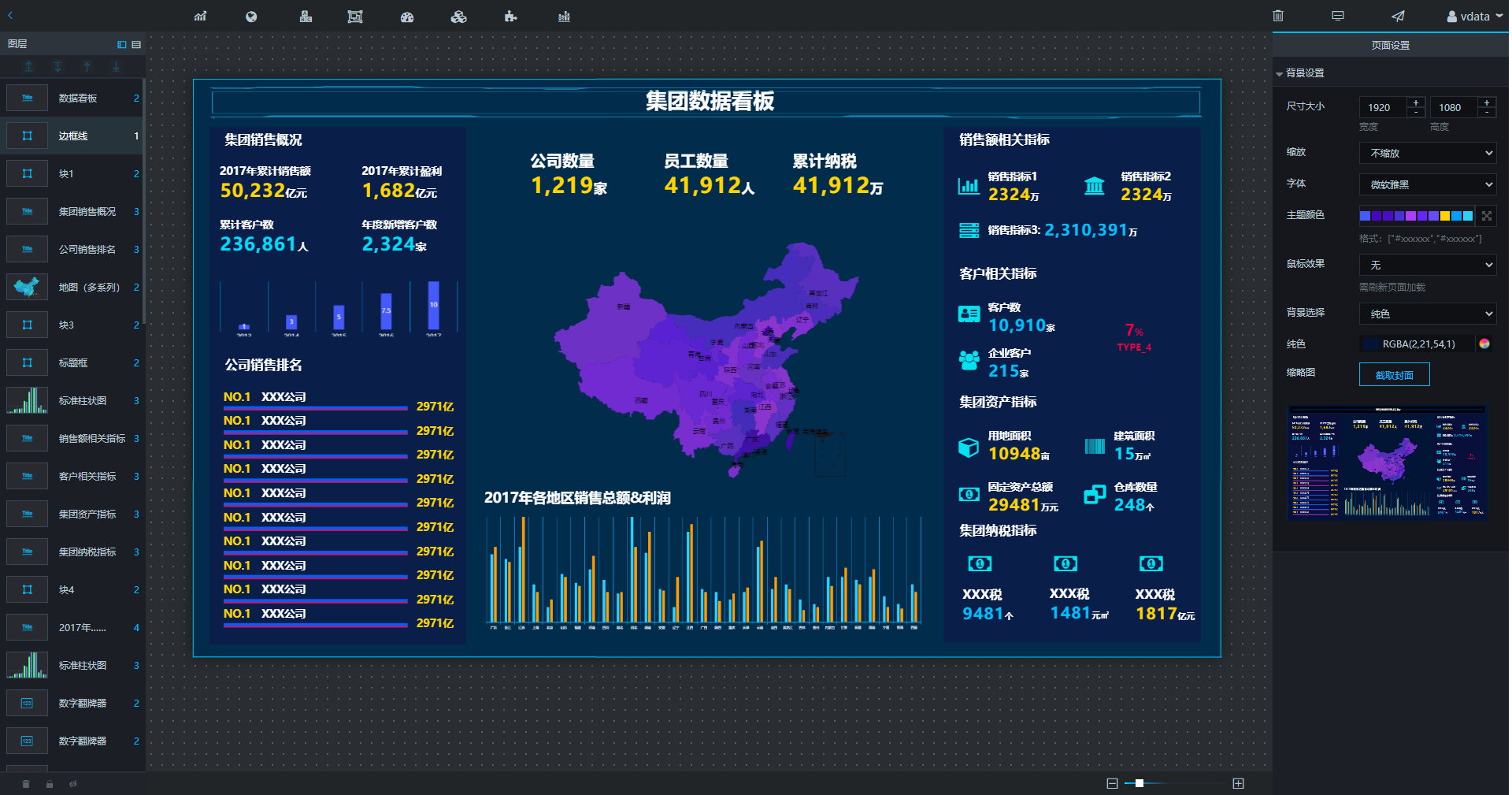 visualization 可视化项目主要功能是让用户能够创建自己的可视化页面,在页面中用户可以创建各种echarts图表,各种动画效果,还可以引入页面等等,此外还可以 echarts图表跟自己的数据库的数据相关联,将数据通过图表表现出来。还有报表工具将数据库的数据通过报表展示出来。 主页面: 主页面为数据的展示:包括可视化、连接数据库的数据以及报表数据,除此之外还可以分享可视化页面。 创建大屏 通过主页面可以创建大屏 可视化设计页面 主要包括了常见的Echarts图表,还有一些特殊动画效果图,右边可以编辑页面和图表的一些属性。 可视化展示 报表设计页面 主要是通过sql语句再结合报表工具设计成excel展示