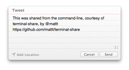 TerminalShare.share(:twitter, text: "This was shared from the command-line, courtesy of terminal-share, by @mattt", url: "https://github.com/mattt/terminal-share")$ terminal-share -service NAME \