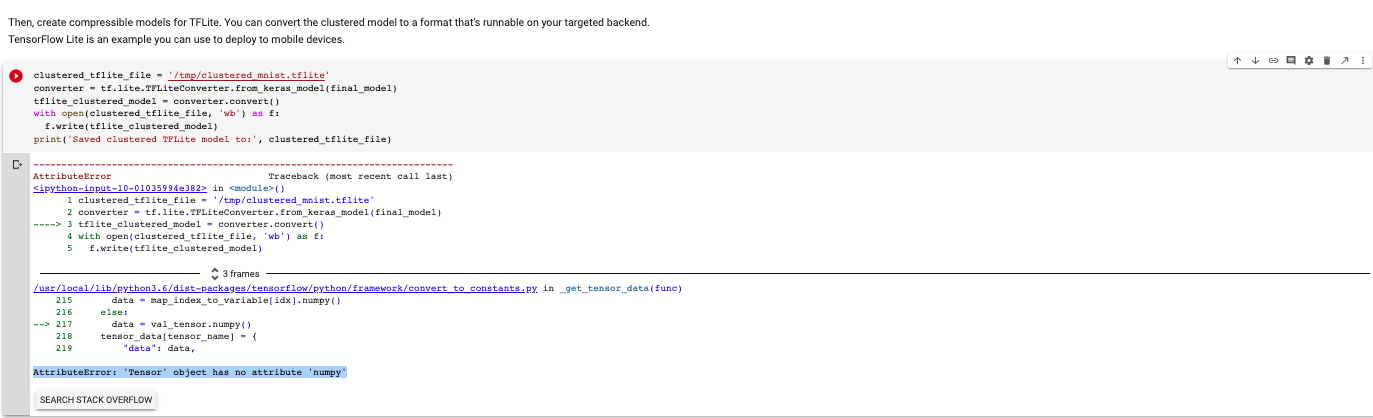 --------------------------------------------------------------------------- AttributeError Traceback (most recent call last) <ipython-input-20-01035994e382> in <module>() 1 clustered_tflite_file = '/tmp/clustered_mnist.tflite' 2 converter = tf.lite.TFLiteConverter.from_keras_model(final_model) ----> 3 tflite_clustered_model = converter.convert() 4 with open(clustered_tflite_file, 'wb') as f: 5 f.write(tflite_clustered_model)3 frames