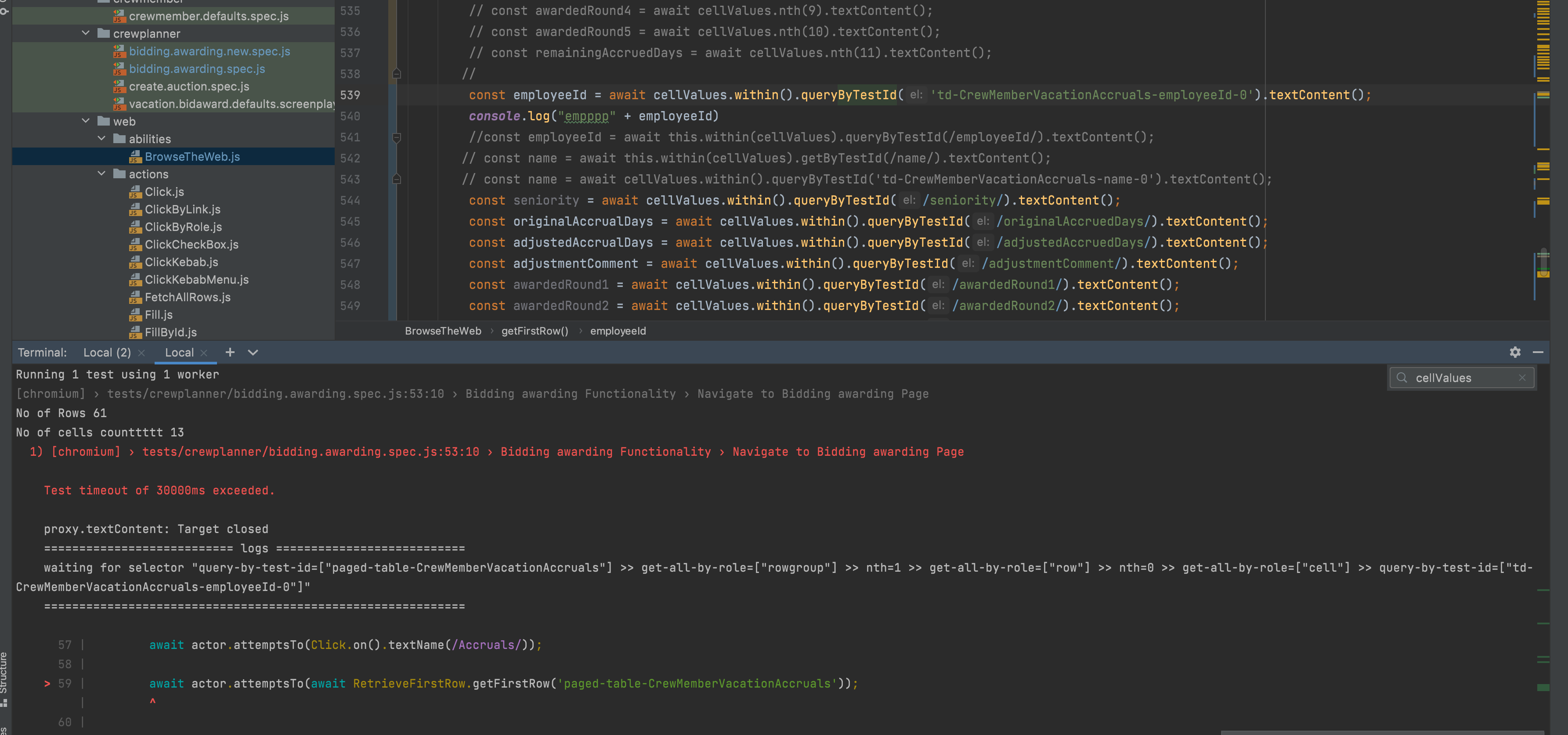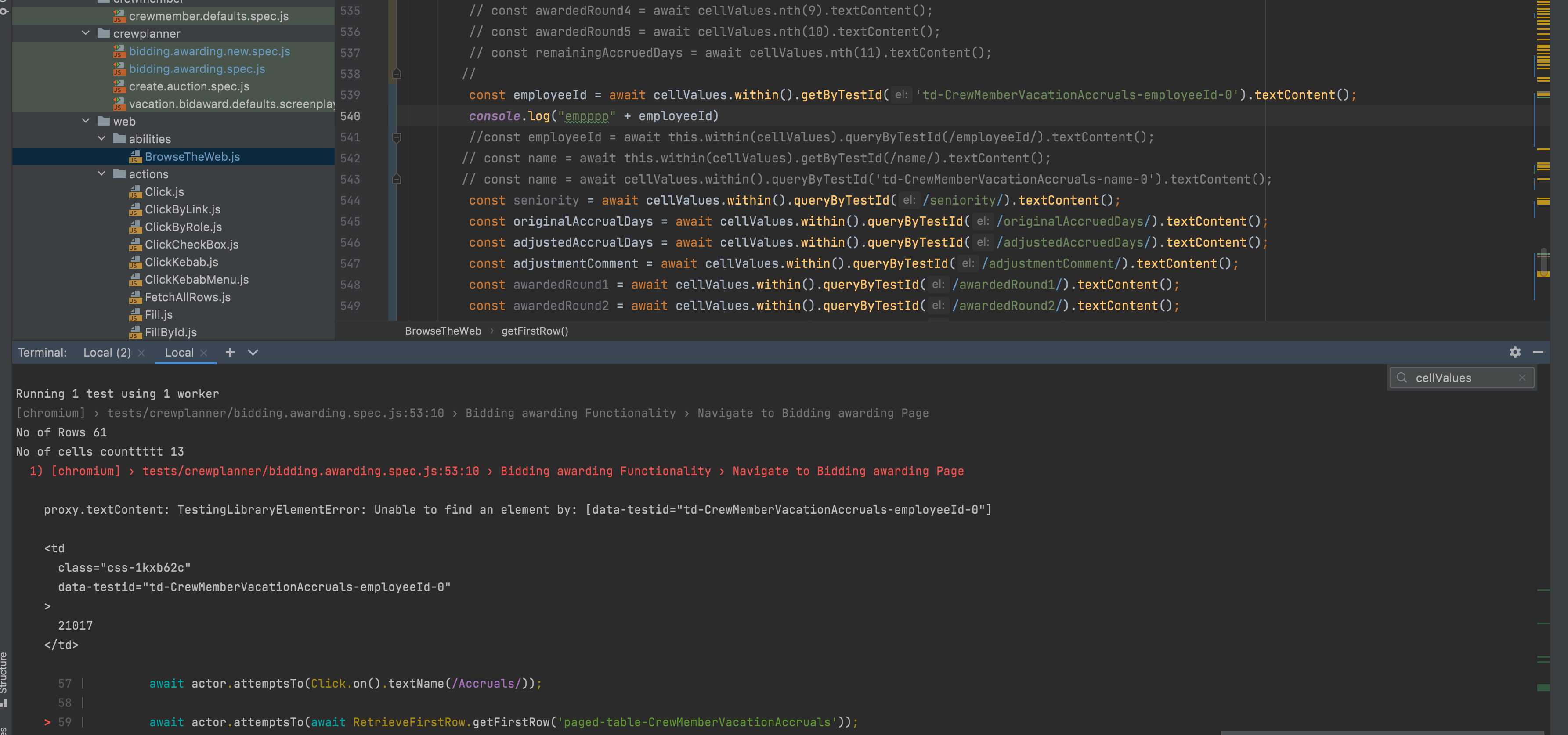 const employeeId = await cellValues.within().queryByTestId('td-CrewMemberVacationAccruals-employeeId-0').textContent();