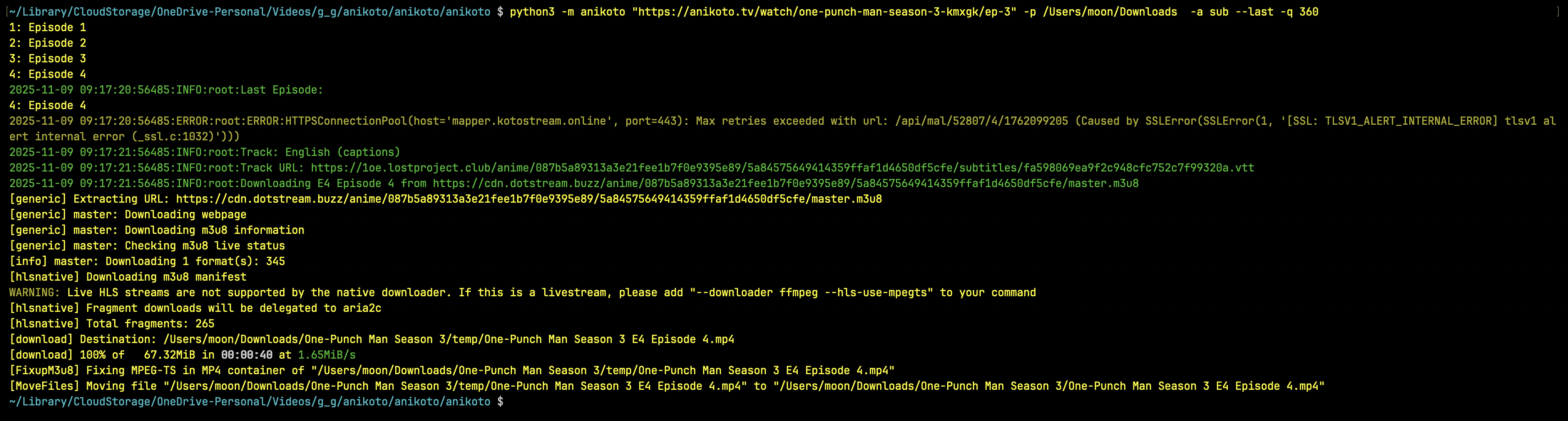 python3 -m pip install git+https://github.com/testingbetaversion/anikoto.gitanikoto https://anikoto.tv/watch/one-piece-odmau -p /Users/Downloads -a sub --range 1129-1129anikoto "https://anikoto.tv/watch/solo-leveling-ilh08/ep-1"anikoto "https://anikoto.tv/watch/frieren-beyond-journey-s-end-c6fbj/ep-1" -p /Users/Downloadsanikoto "https://anikoto.tv/watch/bottom-tier-character-tomozaki-2nd-stage-0et8i" -p /Users/Downloads Default Audio is Dub Subs for sub/dub will be downloaded by default