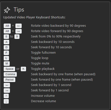 and I suck at CSS.Alt+→, the player window will rotate 90 degrees forward and also adjust the window based on the video dimensions. Same thing forAlt+←, but this one does 90 degrees backwards. You can even watch a video upside-down now if you want! A feature much requested by the australians.However, two shortcuts had to be replaced (