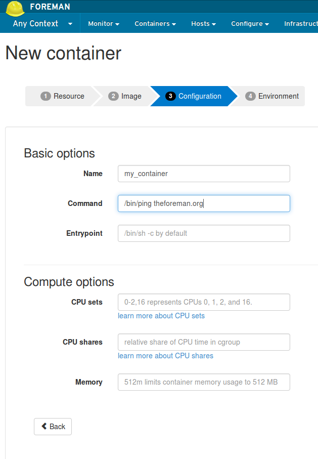 Choose the Docker provider, and fill in all the fields. User name, password, and email are used so that Docker clients such as Foreman can make the host download images from the Docker hub. Your password will be encrypted in the database.