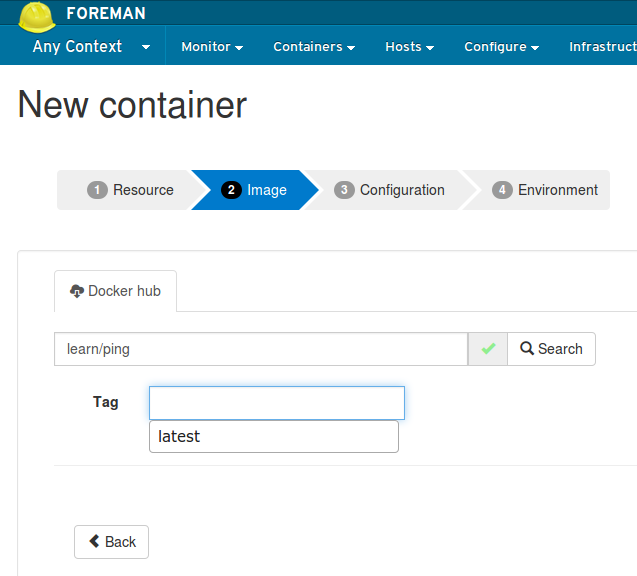 To verify that the installation was successful, go to Foreman, top bar Administer > About and check 'foreman_docker' shows up in the System Status menu under the Plugins tab. You should also see a 'Containers' button show up in the top bar, similar to this