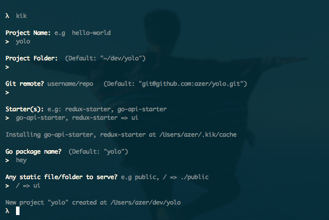Kik is a command-line tool and a library for creating projects by using starters. It'll save your time from initializing projects from scratch, letting you choose what kind of project that you'd like to choose. It's designed not only for JavaScript, you can use it for creating any project by choosing or creating a starter.