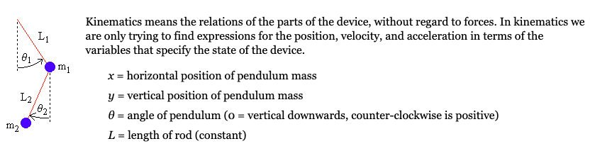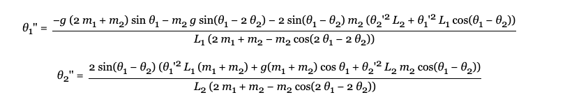 DoublePendulum Double Pendulum Simulation using Processing4 Demo: test.mp4 Variables : *L1 and L2 are named r1 and r2 in the project file Formulas used : Reference for the math formulas: https://www.myphysicslab.com/pendulum/double-pendulum-en.html