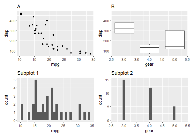 h2 <- ggplot(mtcars) + geom_histogram(aes(gear)) + scale_x_continuous(limits = c(2.5, 5.5), expand = c(0, 0)) + ggtitle("Subplot 2") + plot_layout(tag_level = 'new')