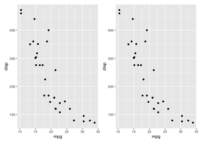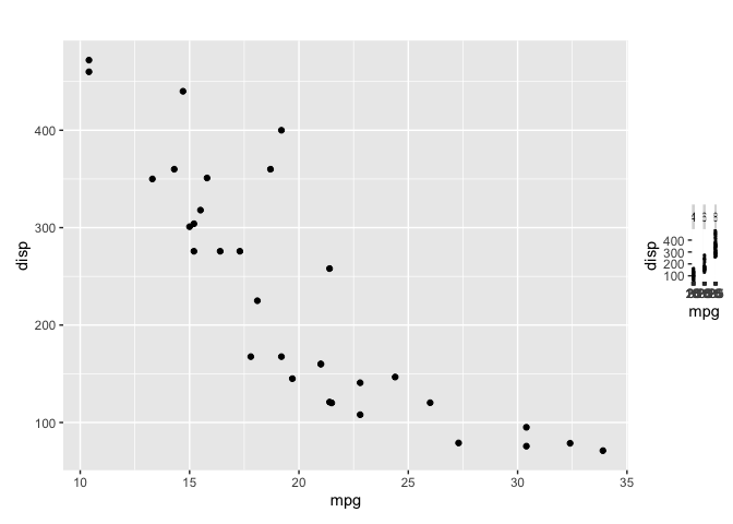 p1 <- ggplot(mtcars, aes(mpg, disp)) +
