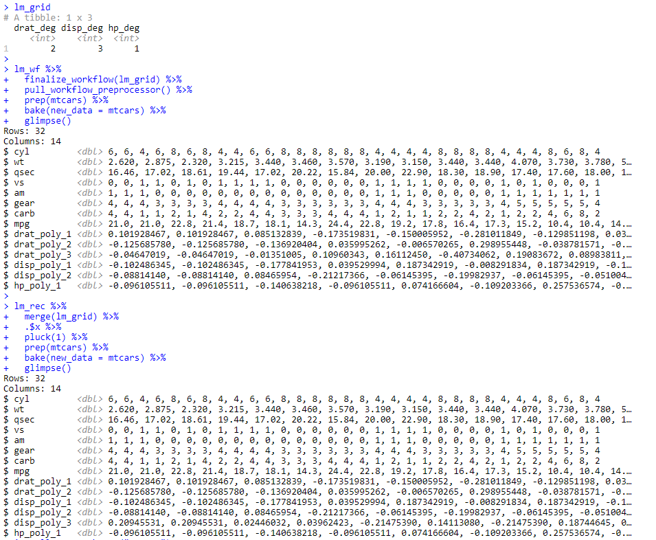 glimpse()Here's a screenshot of the output - finalize_workflow() results in 3 poly terms for drat (instead of two) and 2 poly terms for disp (instead of 3). The when I merge the grid object into the recipe is correct, however.