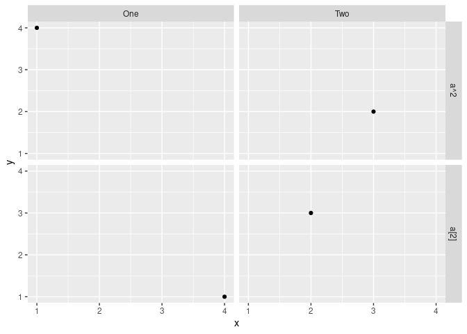 facet_grid(a~b, labeller=labeller(.rows=c(`0`="a^2", `1`="a[2]"), .cols=c(`1`="One", `2`="Two"), .default=label_parsed))Created on 2020-05-27 by the reprex package (v0.3.0)
