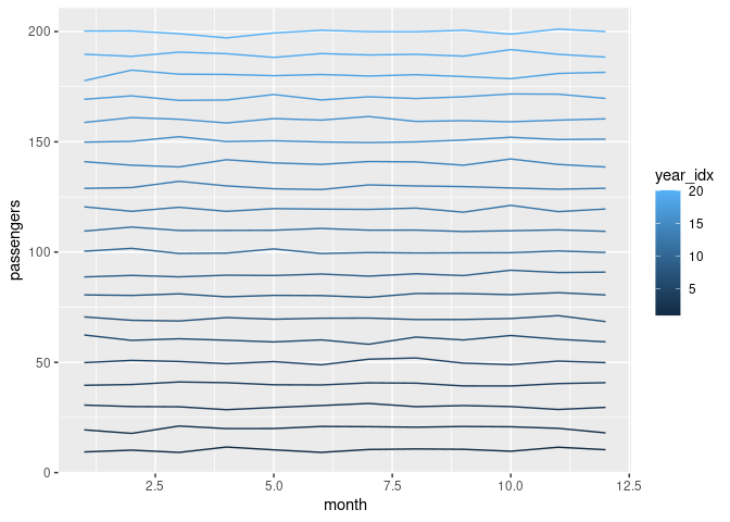 geom_line() # worksggplot(df, aes(x = month, y = passengers, color = year_idx, group = year_idx)) +