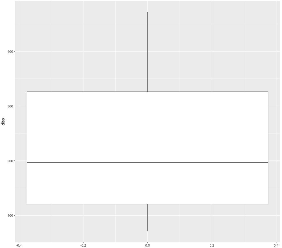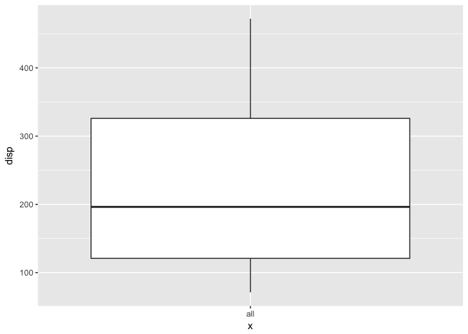 xlocation be at 0 without an axis label; user can always map the x aesthetic if more fine-grained adjustments are required. Ideally, I think the univariate boxplot would look something like this, where the x-axis is essentially removed/treated like a discrete scale. However, I couldn't find a clean way of changing it from a continuous scale from within the geom/stat ggprotos without hard coding the exceptions into the layer building process.
