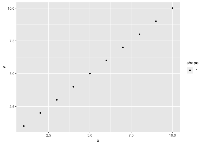 ggplot(df, aes(x, y, shape = "*", pch = "a")) + geom_point()