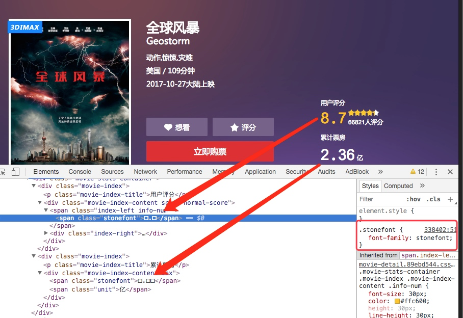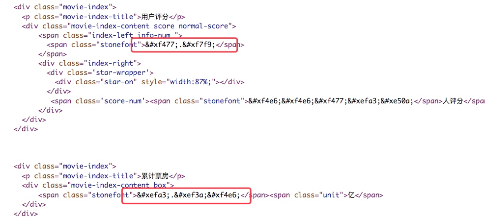 猫眼网站上几乎所有重要的数据(数字),都是通过加载字体集,然后按unicode去映射展示。因为每次页面重新加载,字符集就会同时刷新,所以无法通过事先记录数字映射表的方式来进行解析。