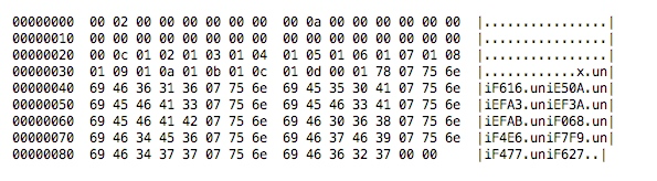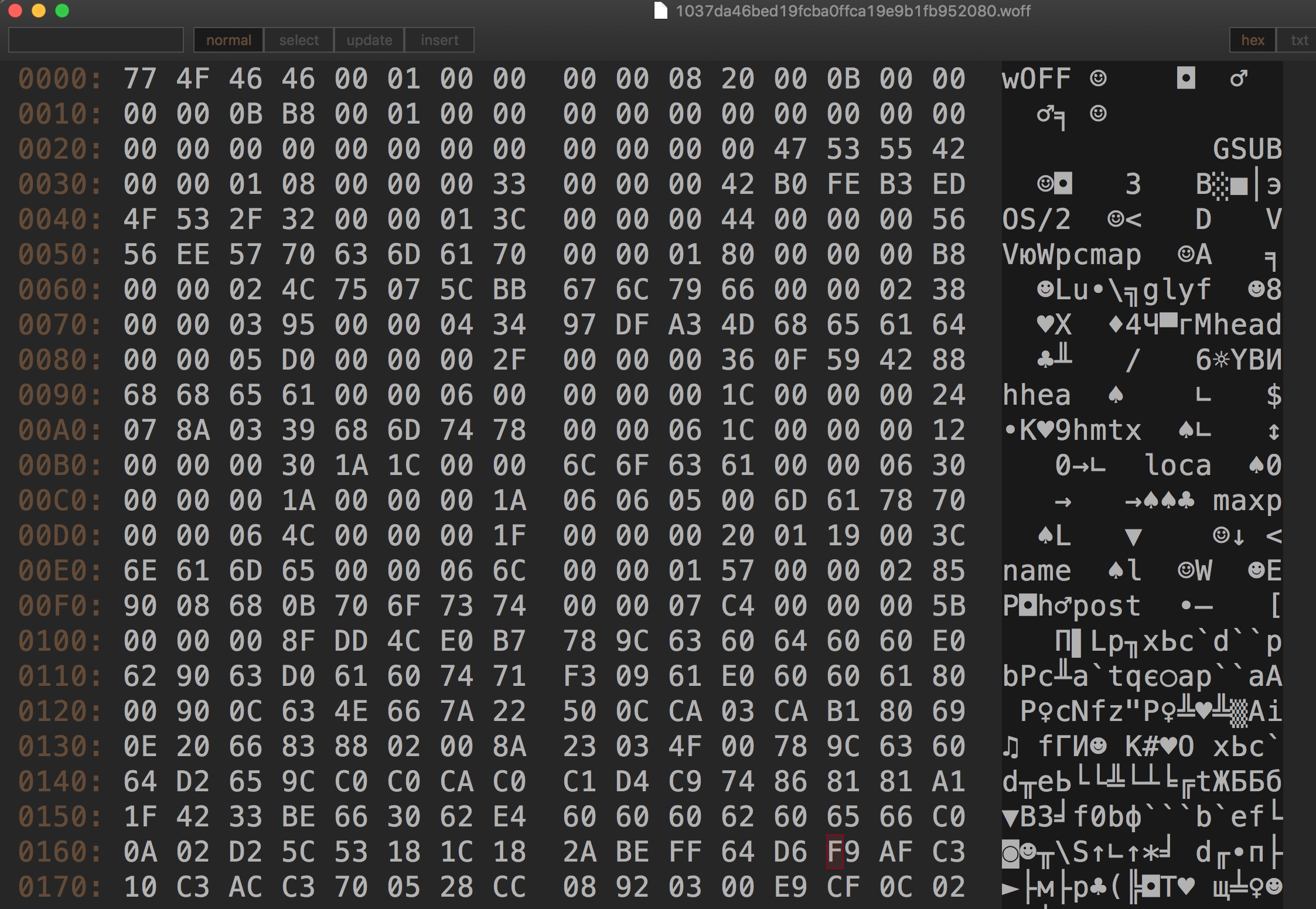 为了方便大家学习和查看,随便贴一张猫眼WOFF文件的Hex图,大家可以根据上面提到的结构对号入座,看看是否能手工找到length和table的位置: