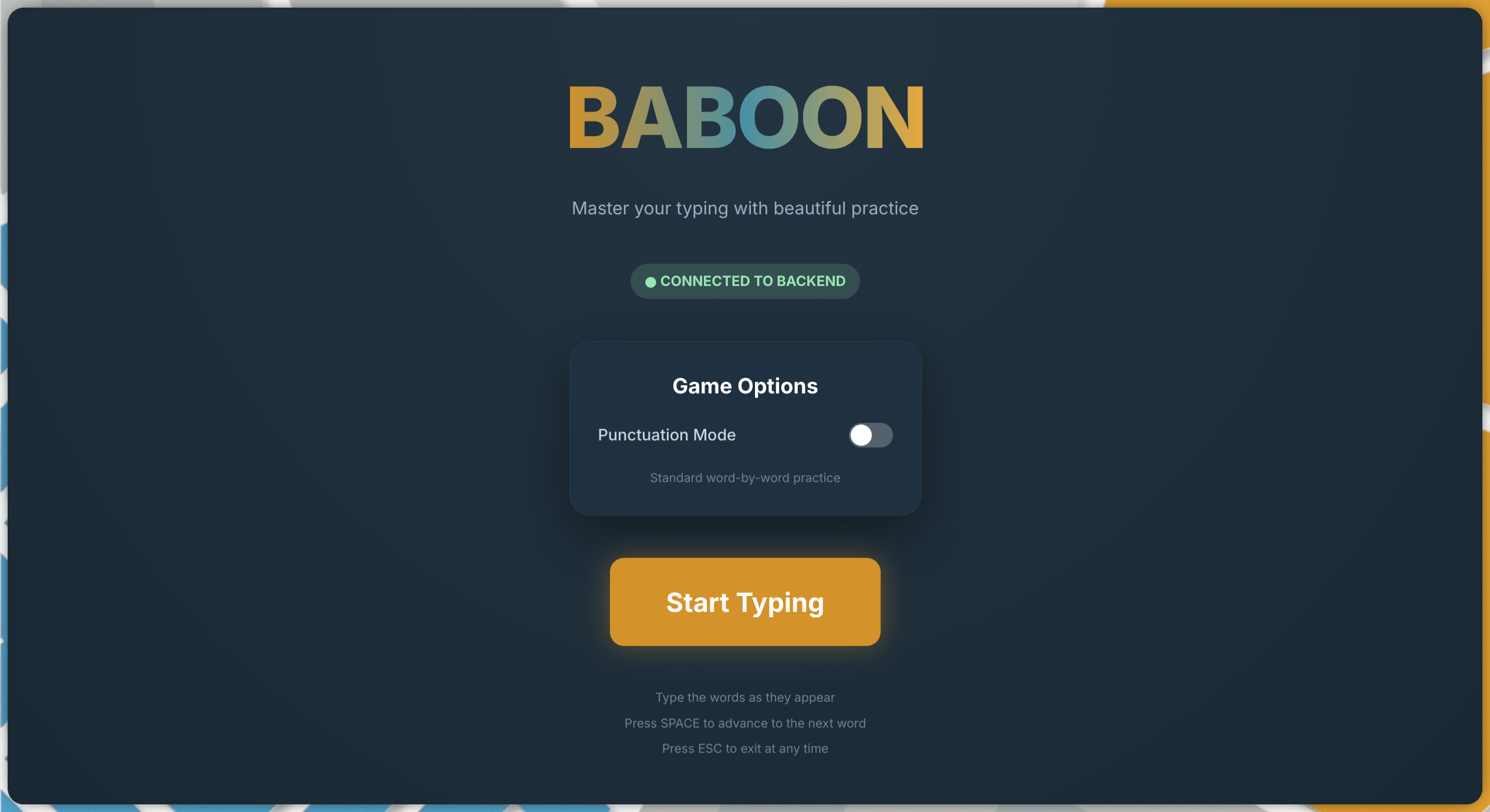 Master your typing with beautiful practice! Baboon is a cross-platform typing practice application that helps you improve your typing speed and accuracy.