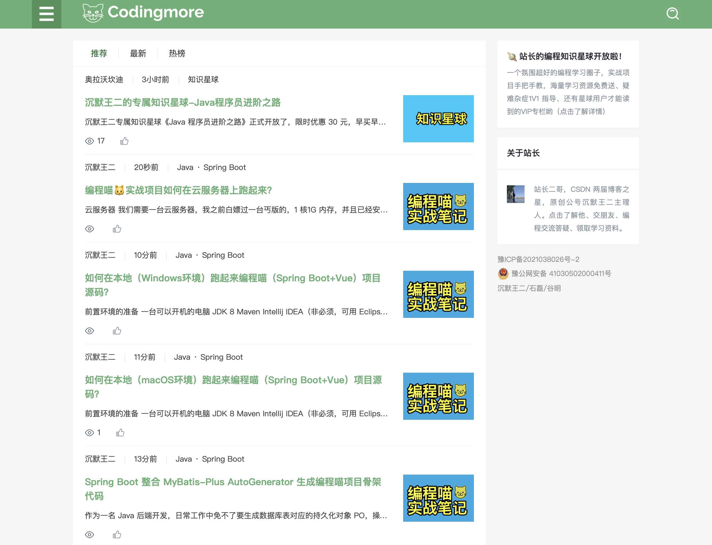 编程喵🐱(Codingmore)是一套成熟的编程类学习网站,基于 SpringBoot+Vue实现。Web 端包含首页门户、文章搜索、文章展示、文章推荐等模块。网站管理端包括统计报表、文章管理、栏目管理、权限管理等模块。