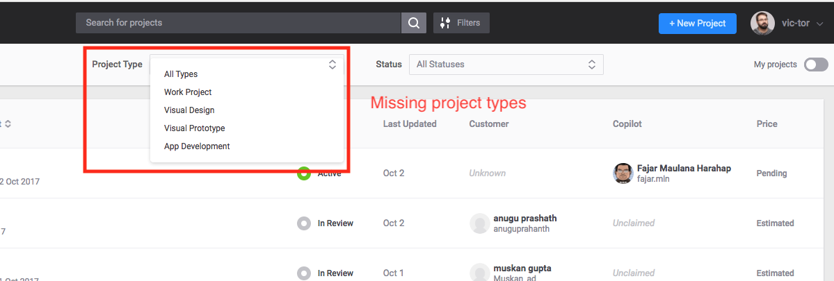 Fix all the missing project types listed in the admin view filter  Created from Aha! https://topcoder.aha.io/features/TCCONNECT-70