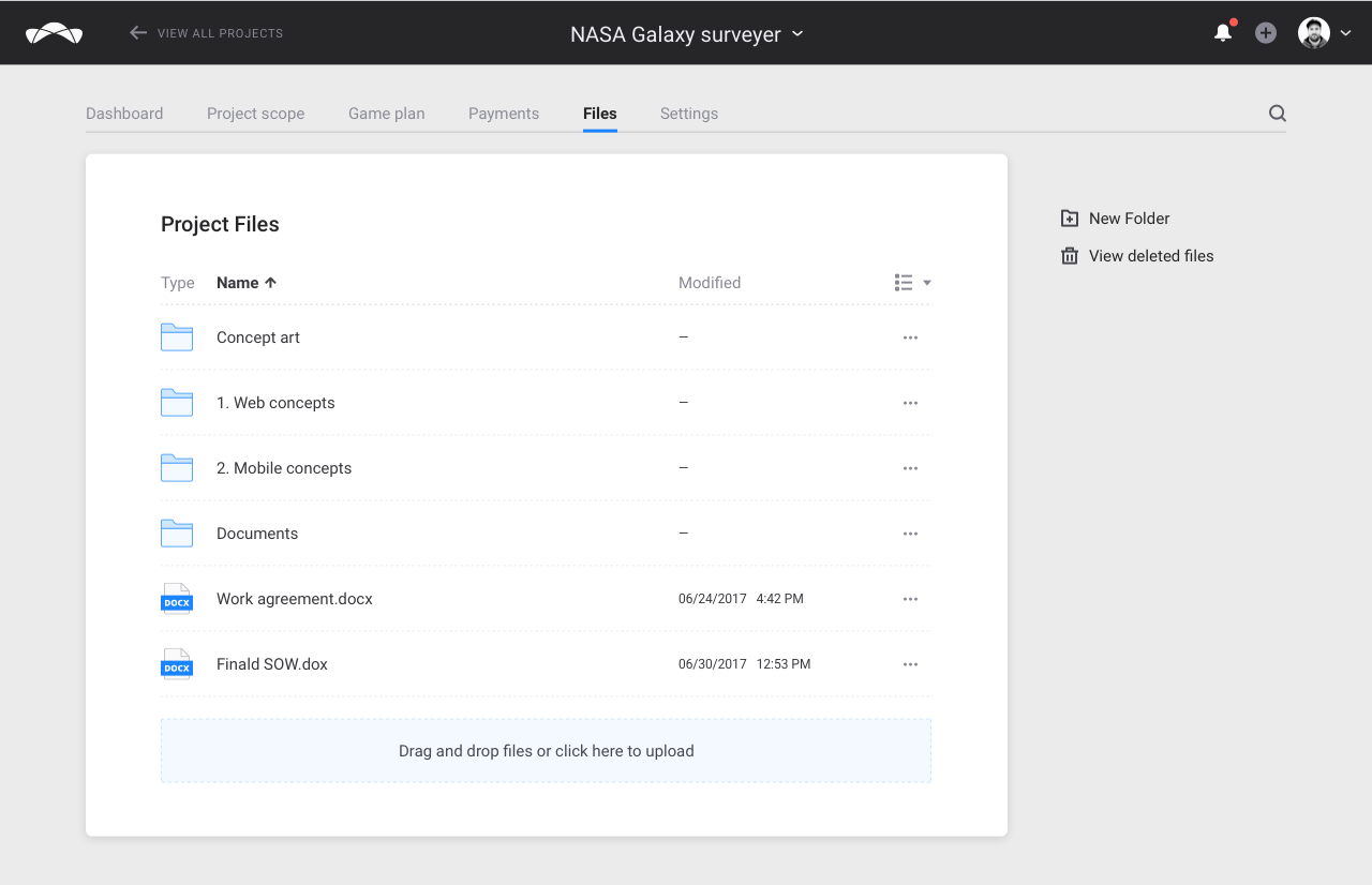 We need a general solution for file sharing on the project, probably with a dedicated tab for files with directory support.