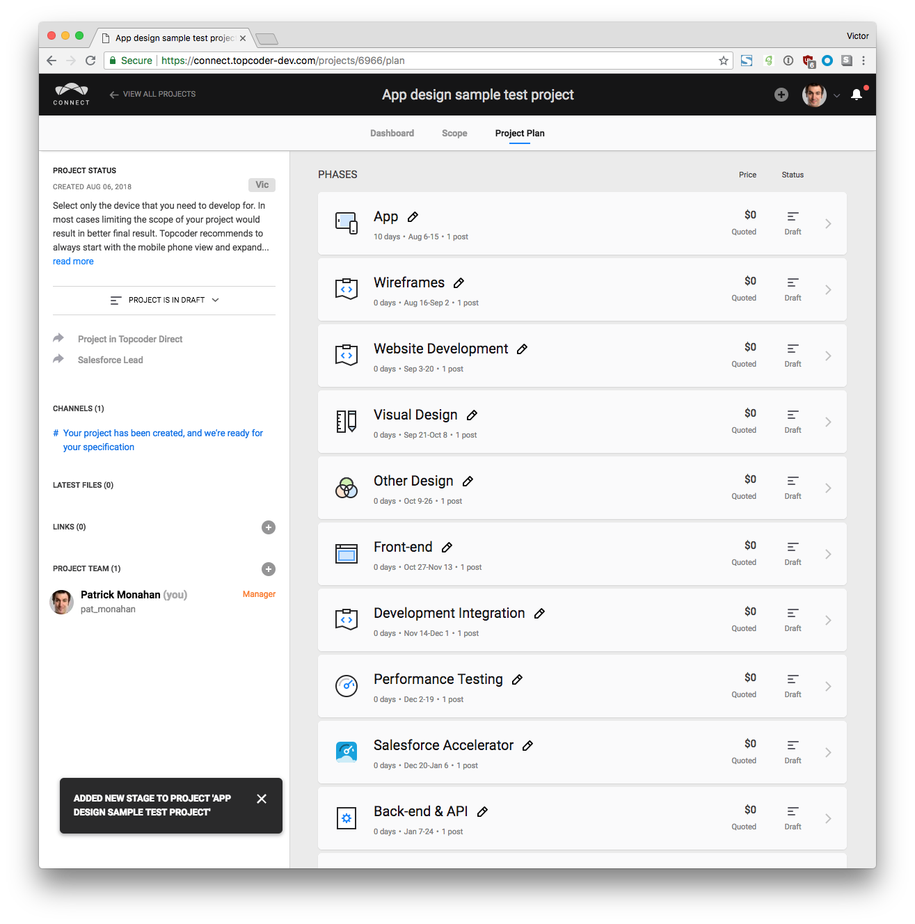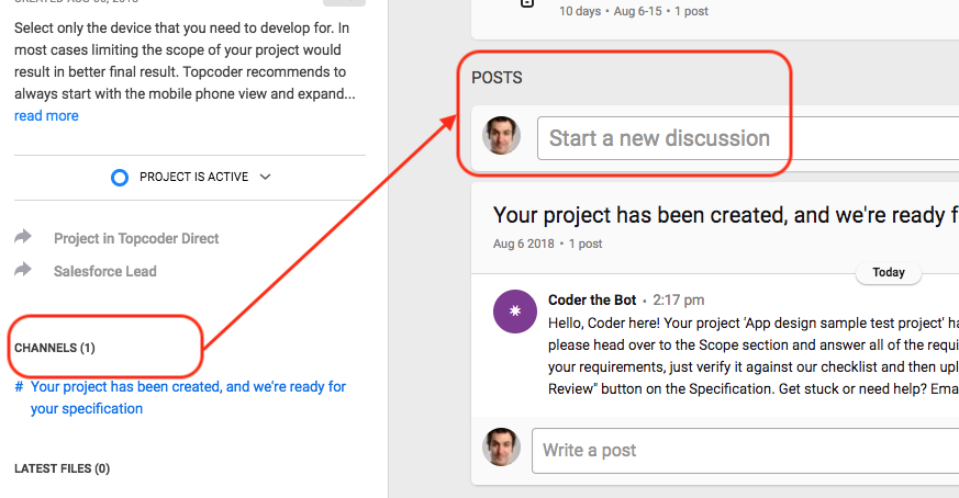 Hello, Coder here! Your project 'App design sample test project' has been created successfully. For your next step, please head over to the Scope section and answer all of the required questions. If you already have a document with your requirements, just verify it against our checklist and then upload it. Once you're done, hit the "Submit for Review" button on the Specification. Get stuck or need help? Email us at support@topcoder.com.