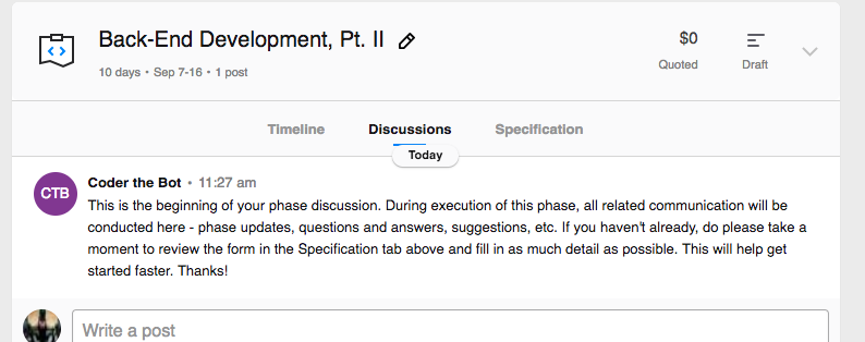Do not make a welcome post to the phase discussion (Posts tab) before the phase is active.  continued from https://github.com/appirio-tech/connect-app/issues/2301 Aha! Link: https://topcoder.aha.io/features/TCCONNECT-450