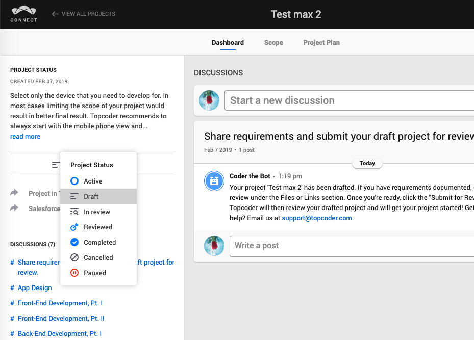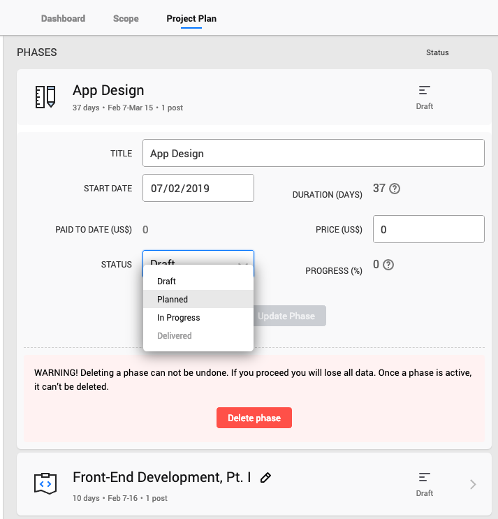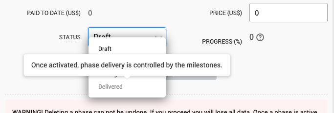 Activein the propdown should be disabled. And when we put mouse on it there should be tooltip shown:To activate project there should be at least one phase in "Planned" status. Please, check "Project Plan" tab..The hidden option and tooltip should work same as for phase status dropdown: