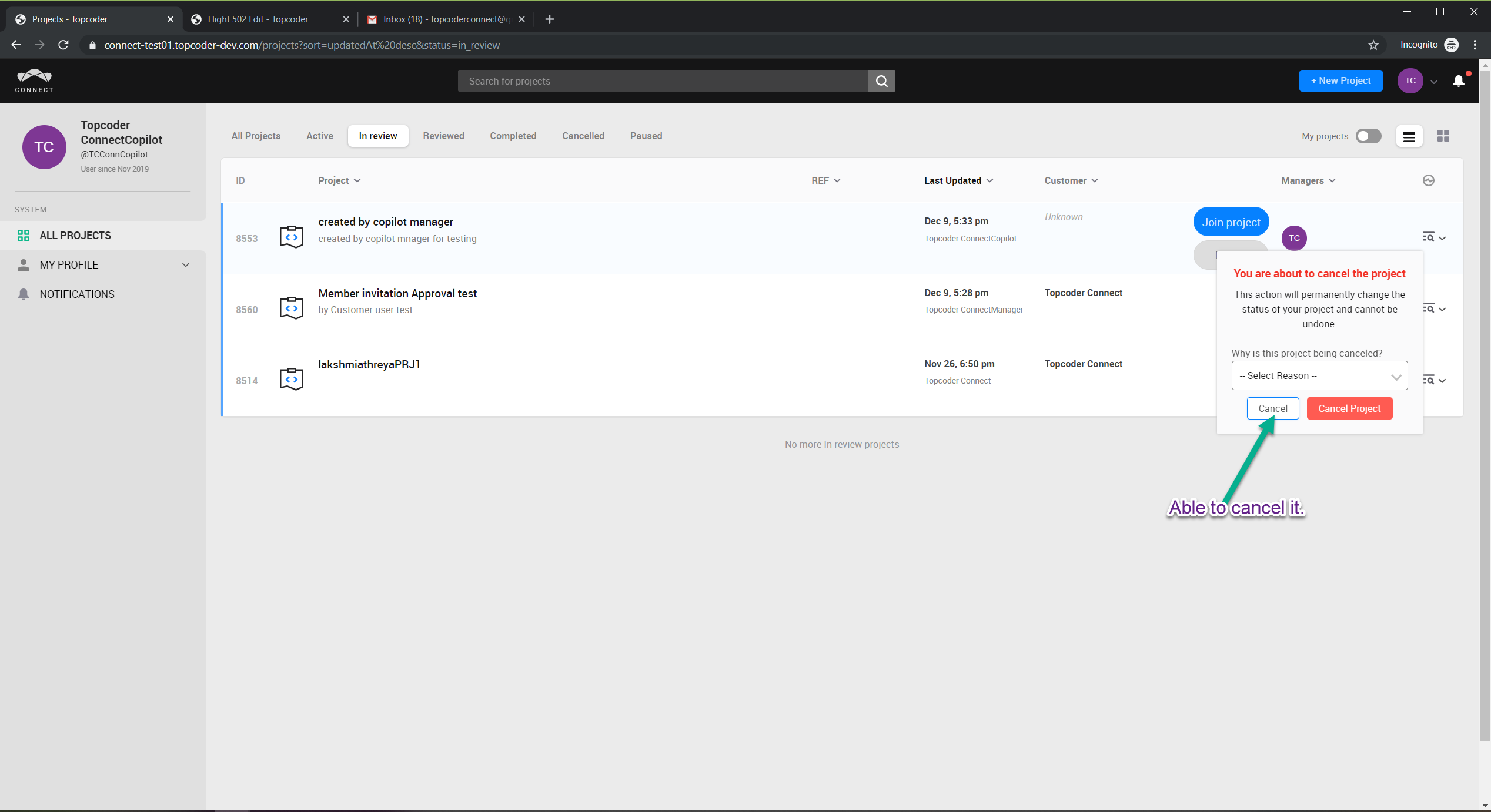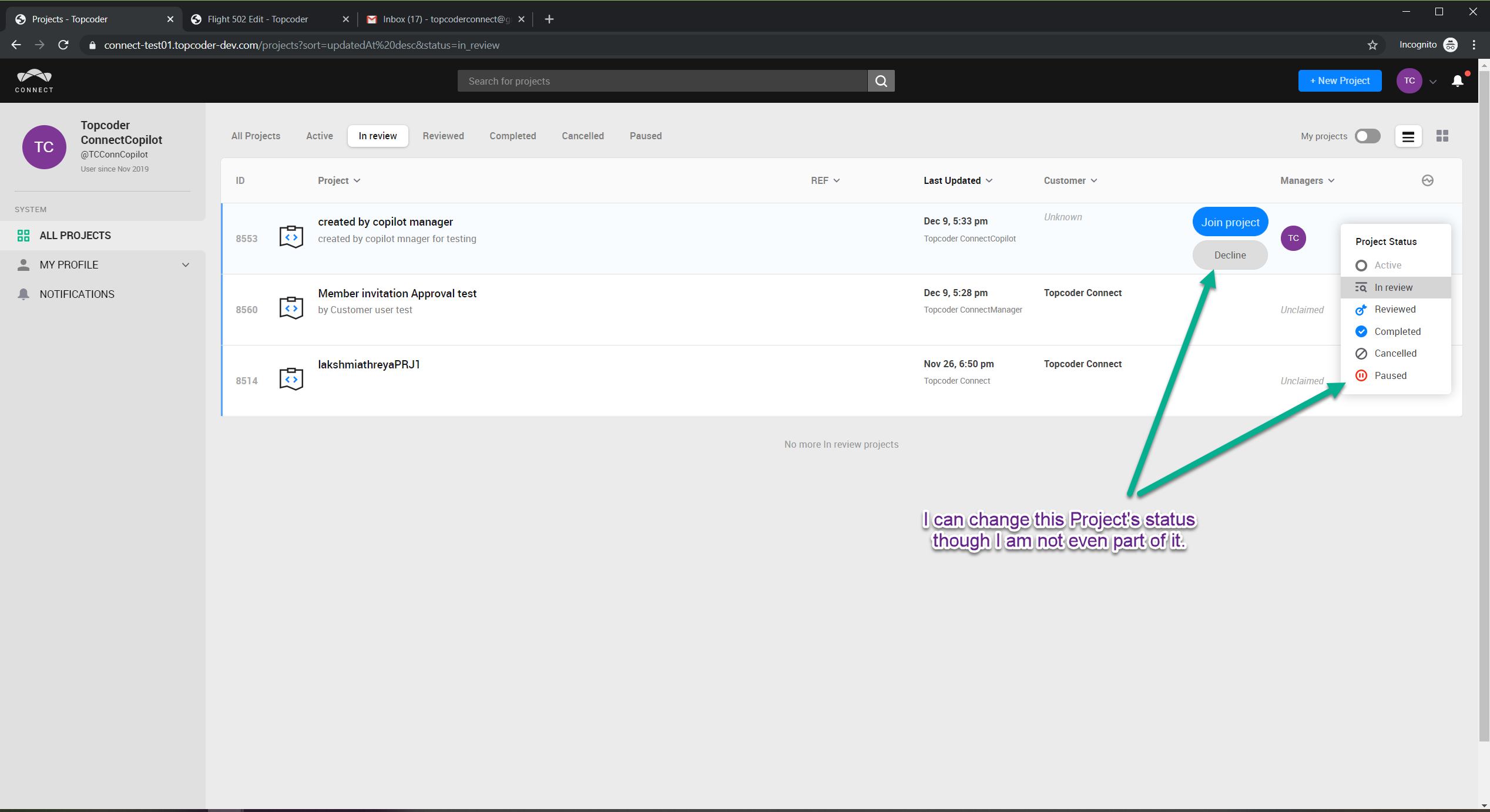 - Observe that the user has an option to mark a project as cancelled or paused or anything, though this user is not even part of that project.