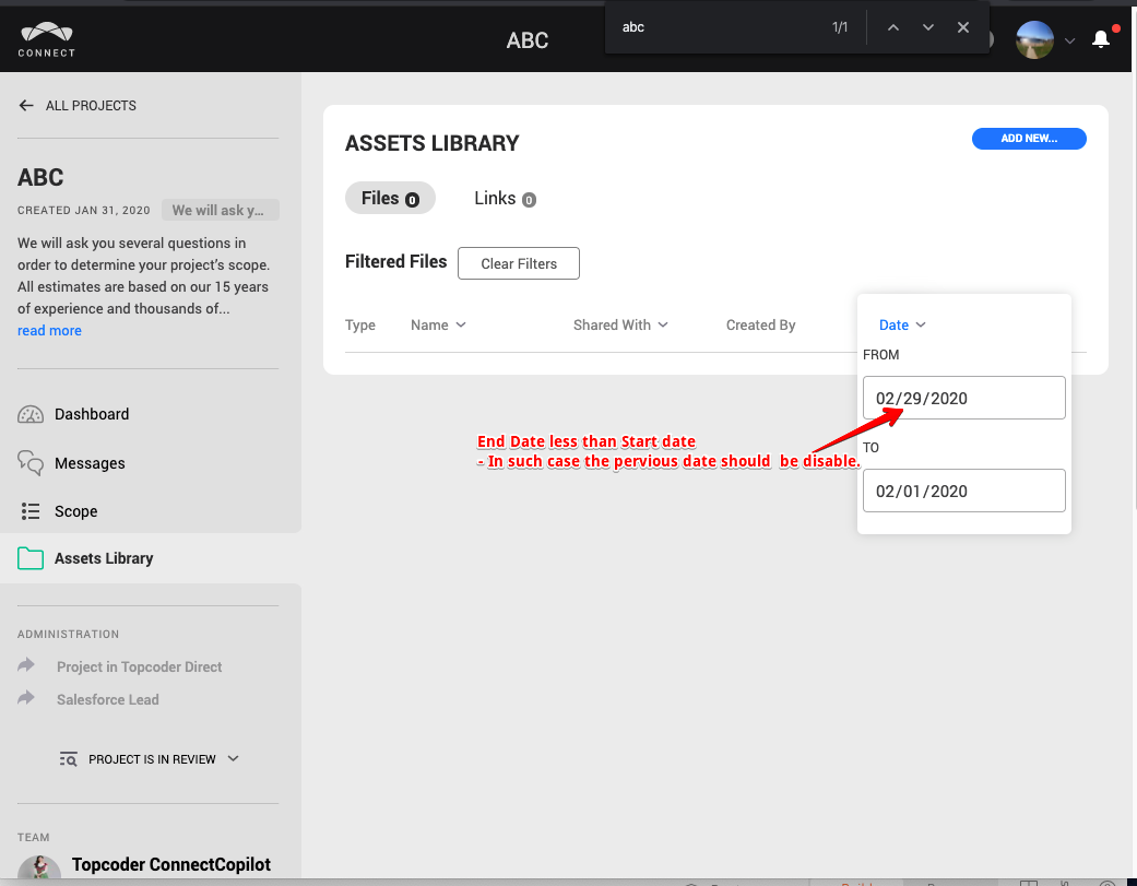 On the Assets Library page we can apply filters to the files and links, see page https://connect.topcoder-dev.com/projects/8600/assets
