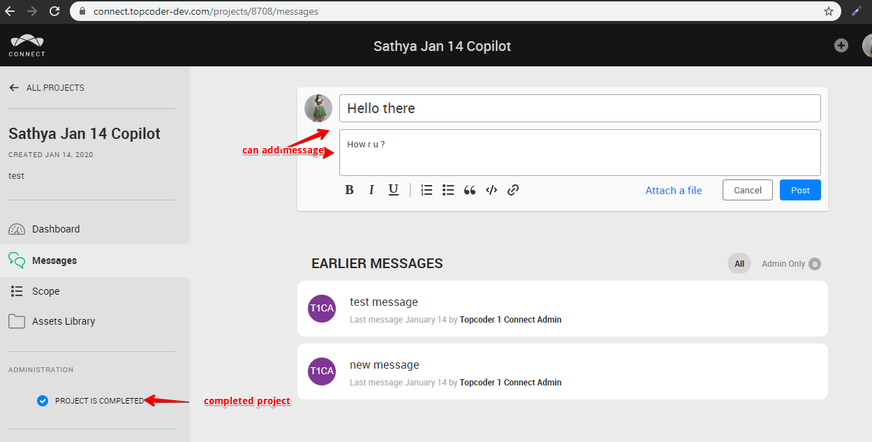 User is able to change/edit/add the information like Messages/Assets in the completed projects..