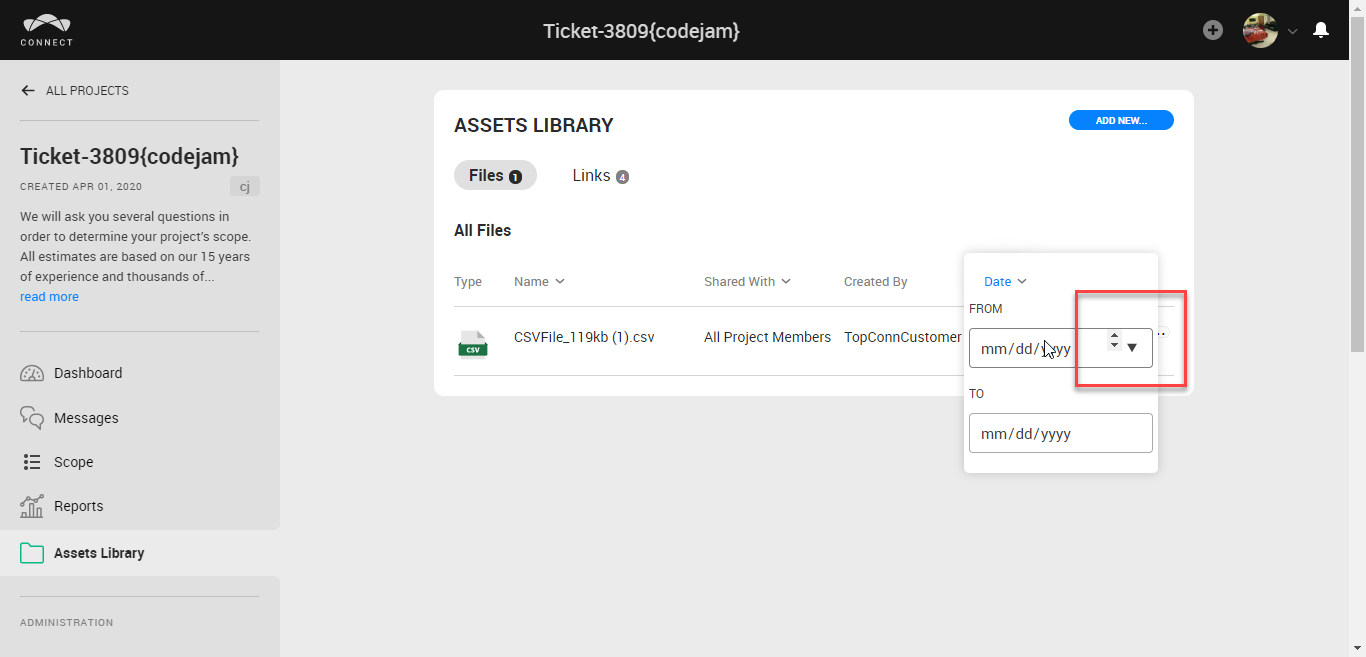 'Date' column header; Date time picker has a dropdown icon and spinner icon