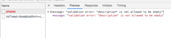 Does not allow phase description to be empty or null at API endpoint. Now in the FE, we use space string to allow empty description but it will need to be updated later (based on this).