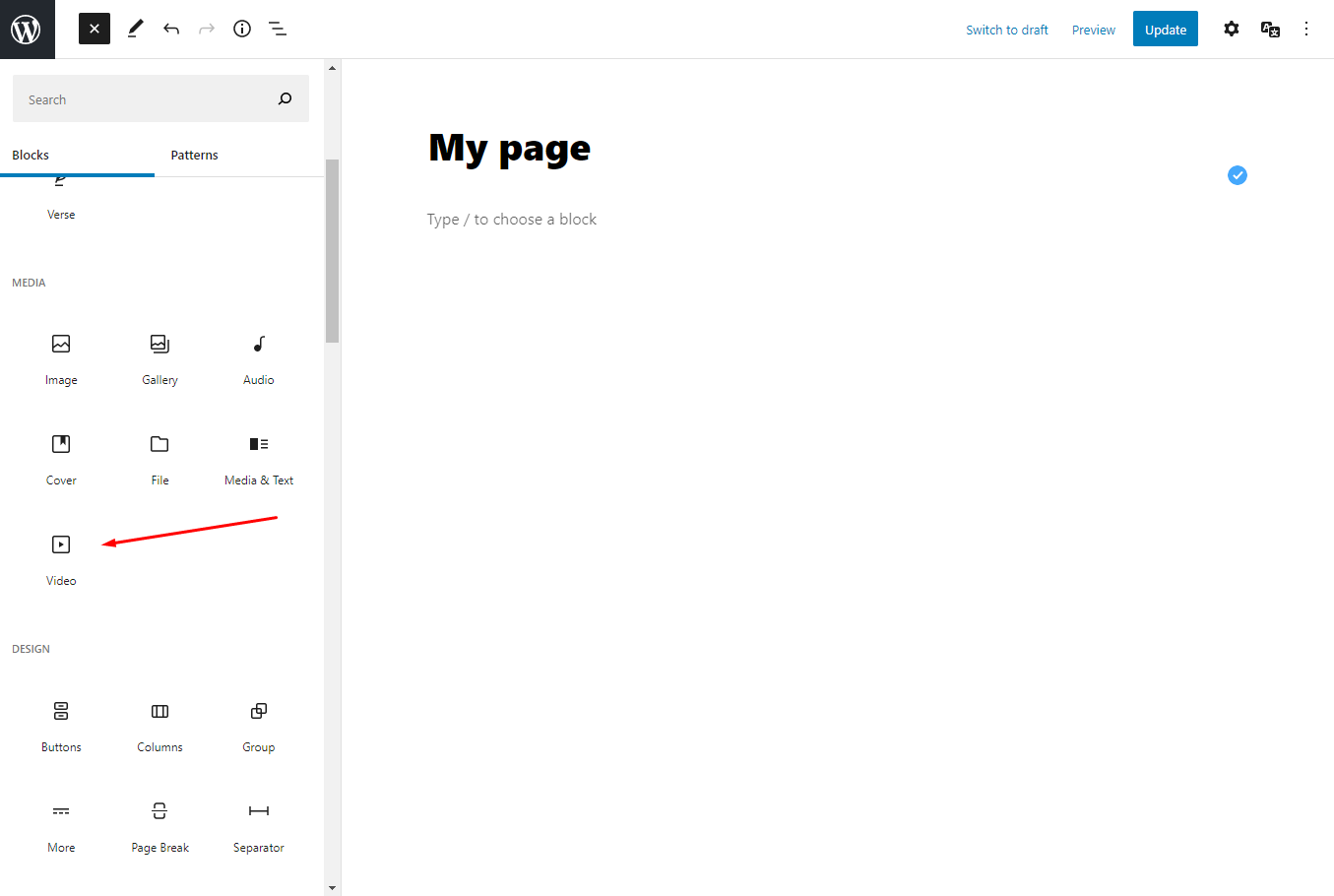 5. When creating a page, click on the button "Toggle block inserter" and select a block "Video"