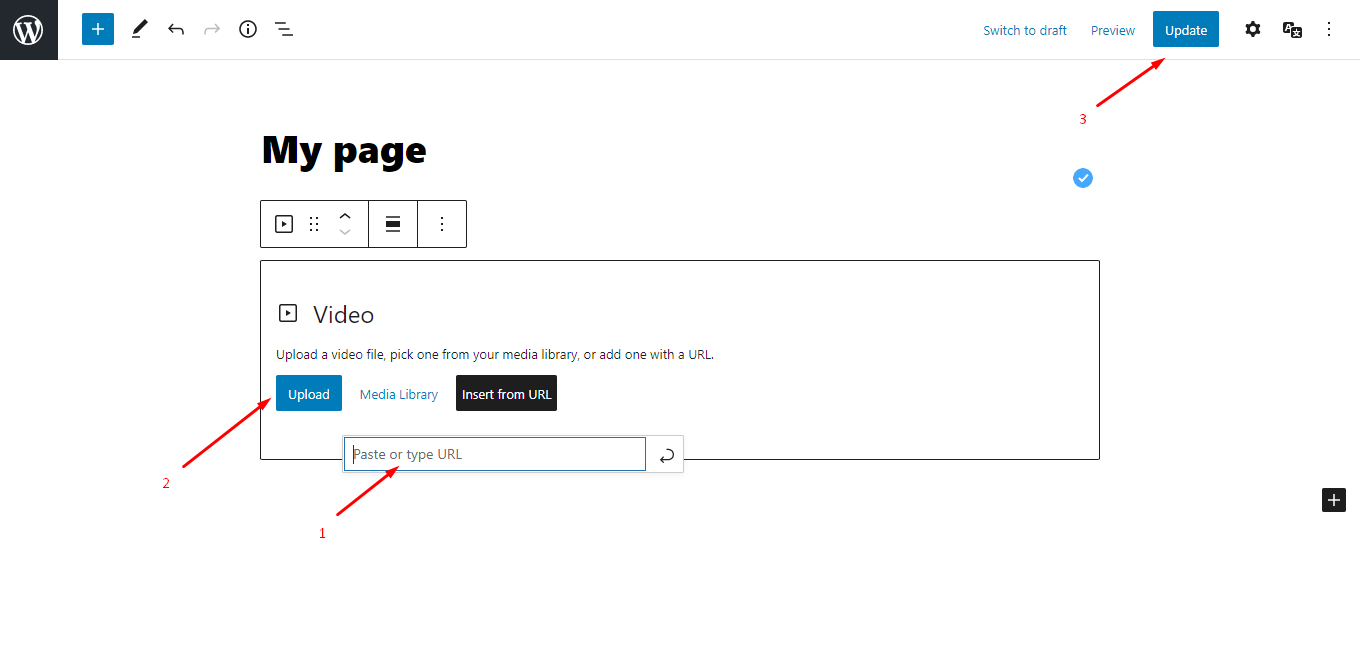 6. When inserting a video block, select "Insert from URL", enter a link to the video file in the format "/ipfs/<cid>" click on the button "Upload" and click on "Publish" or "Update".