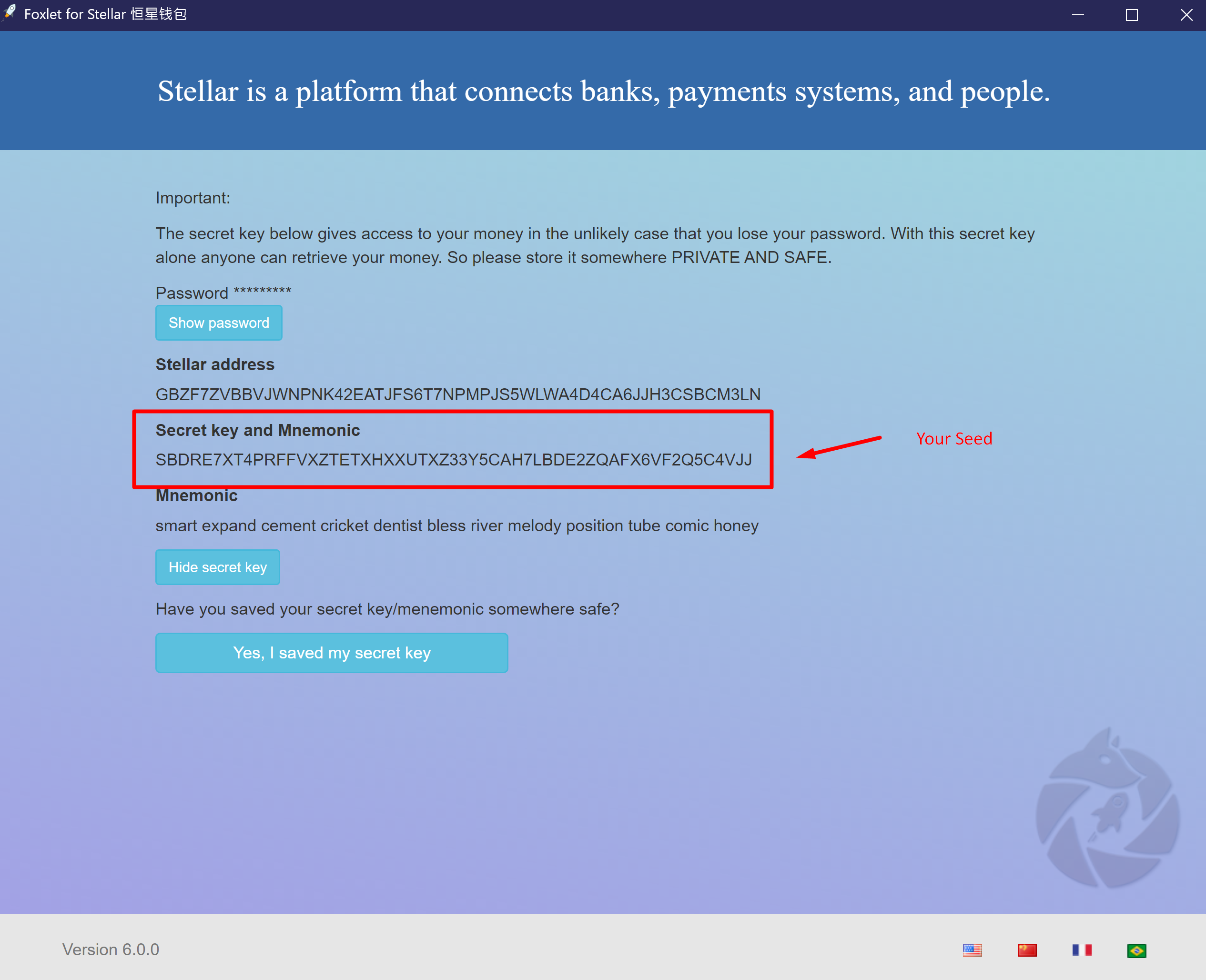 - Then you need to get the secret key by clicking on the "Show secret key" button. This key is your seed.