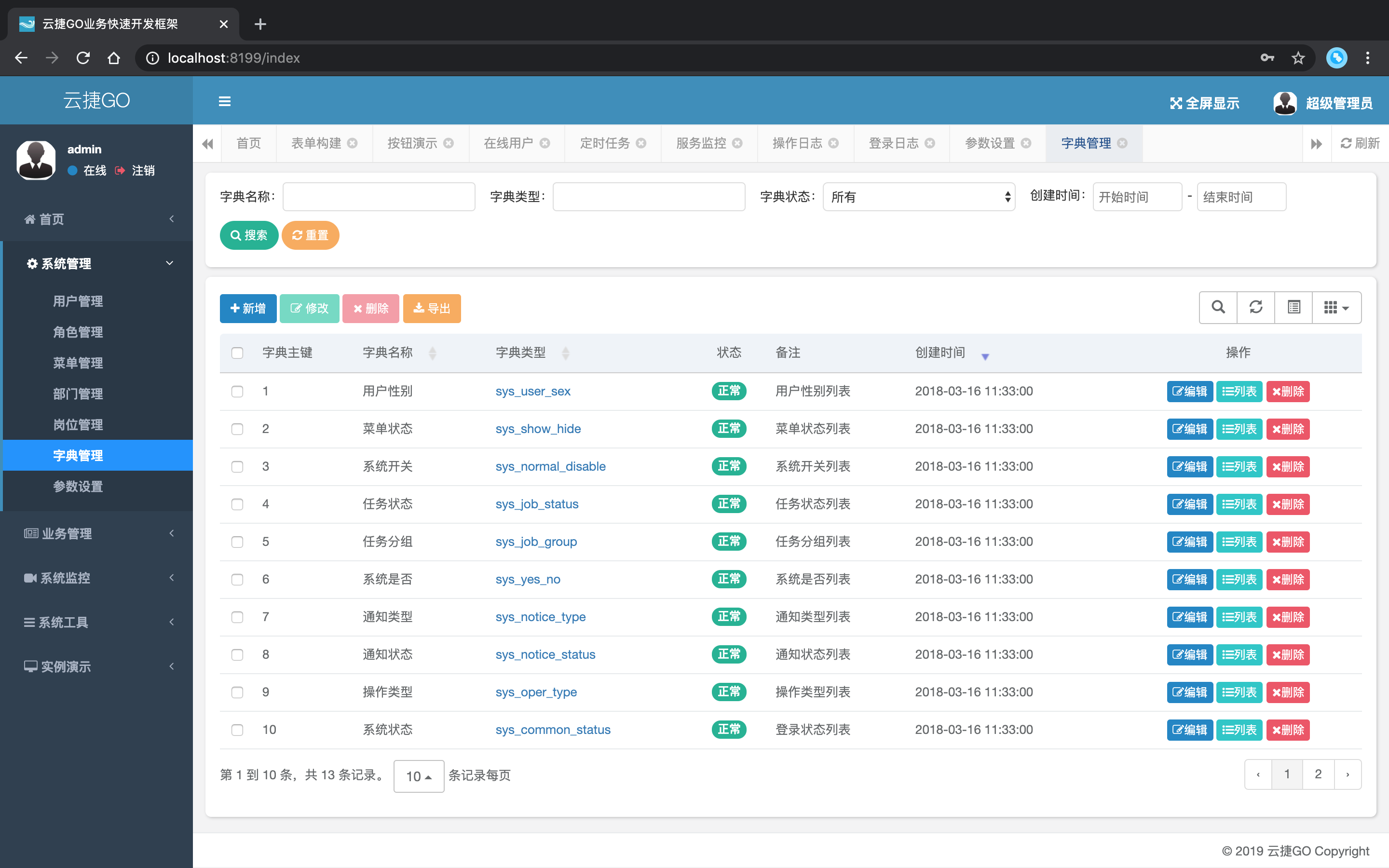 以前是做Java企业应用开发,想转Go,看了很多优秀的开源项目但是发现没有合适的,一直没找到类似于若依开发思路的快速开发框架。于是狠下心自己写了一套后台系统。这个框架可以用于所有的Web应用程序,如网站管理后台,网站会员中心,CMS,CRM,OA。所有前端后台代码封装过后十分精简易上手,出错概率低。同时支持移动客户端访问。系统会陆续更新一些实用功能。