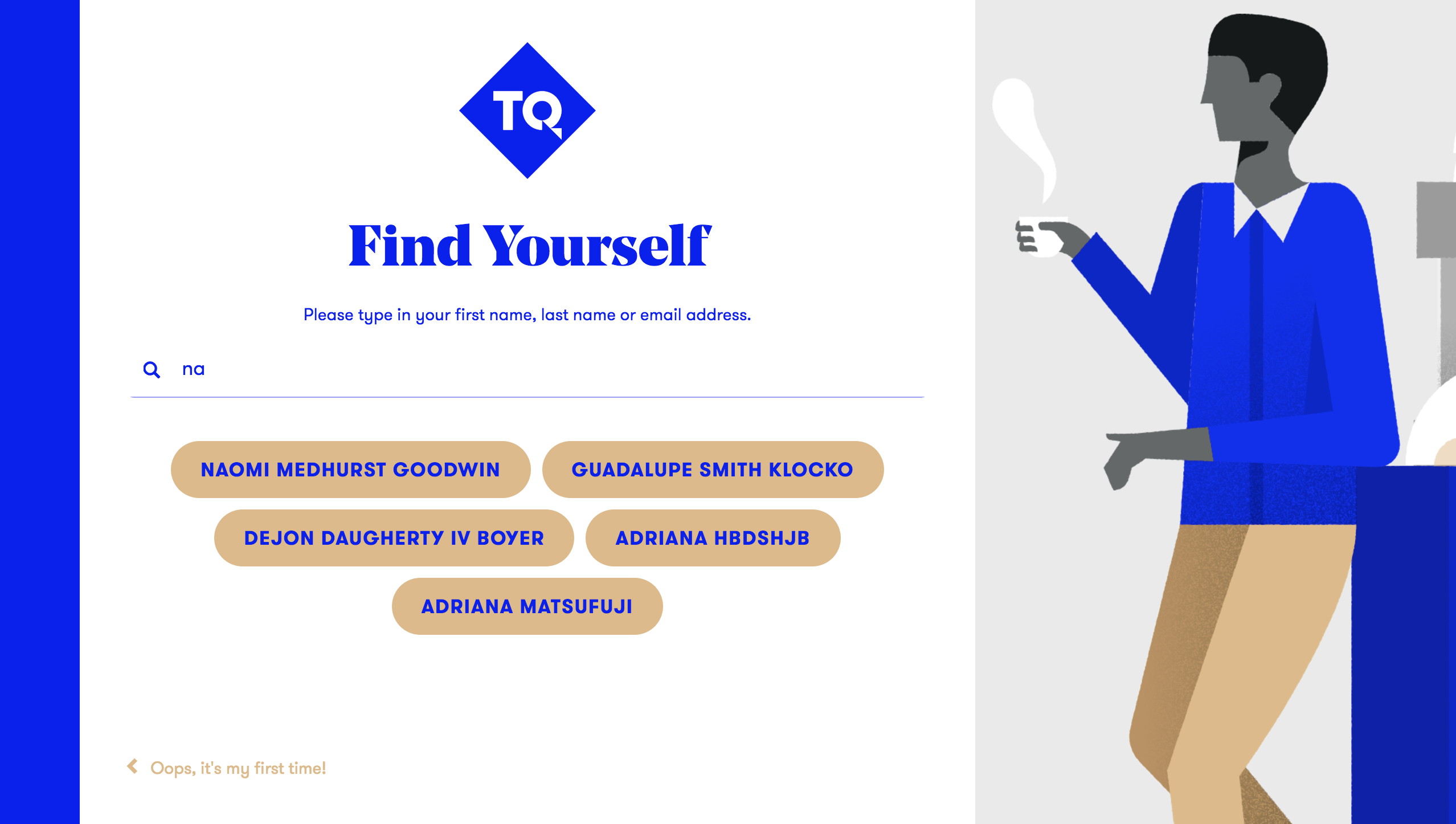 In this page, the user that has already register, can find himself in with a responsive search field. You can confirm your identity and your visit by clicking on your name. Also, if the visitor doesn't have a booking, it will be automatically created and confirmed.
