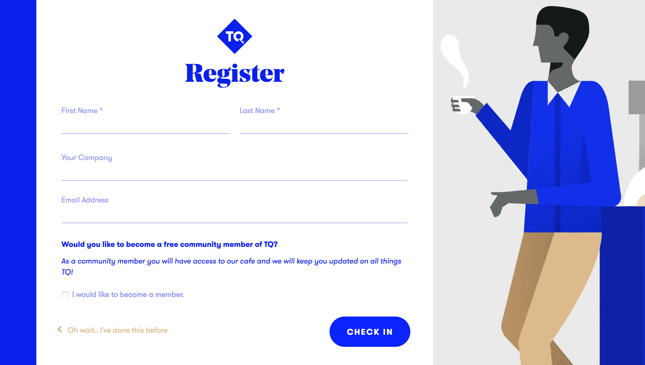 In this page, the users that have never been in the building before, can register as visitors. When the registration is submitted, the system automatically creates and confirm a booking for that user. Users errors are taken into account by using validations for each field.