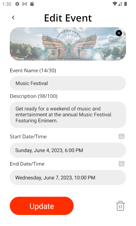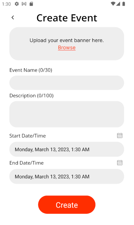- Timeline management: Earliest, upcoming and in-progress events will appear in the home screen to notice users. Timeline is shown clearly on each event cards.