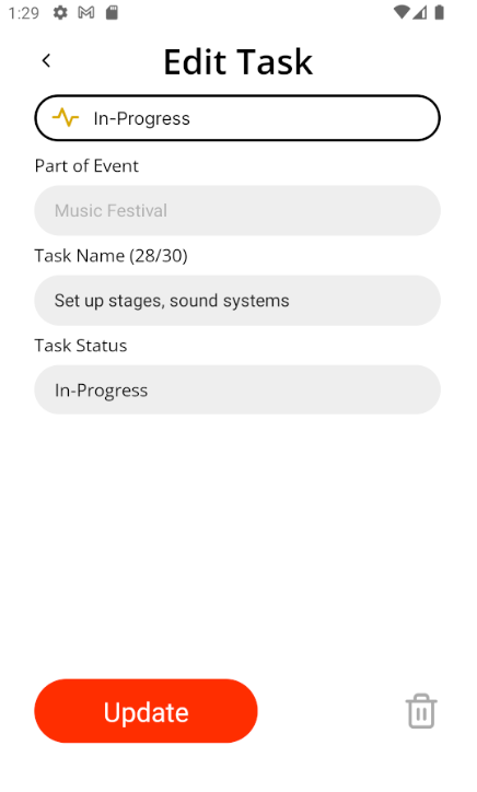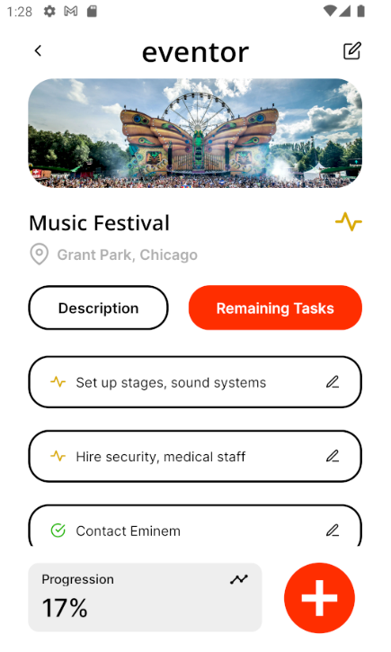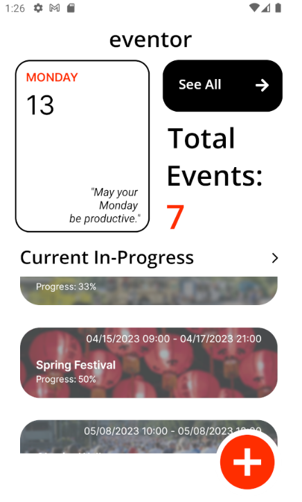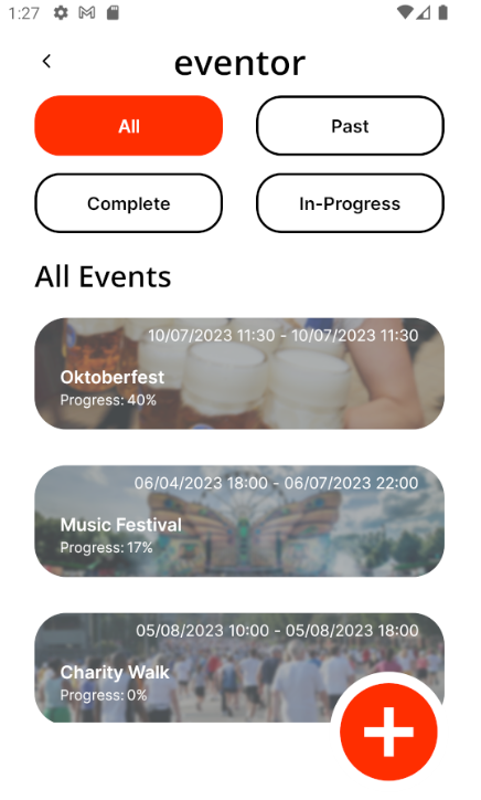 - Events' Progress Tracking: Users can track the progress of their events. The event's progress is shown clearly on that event card.