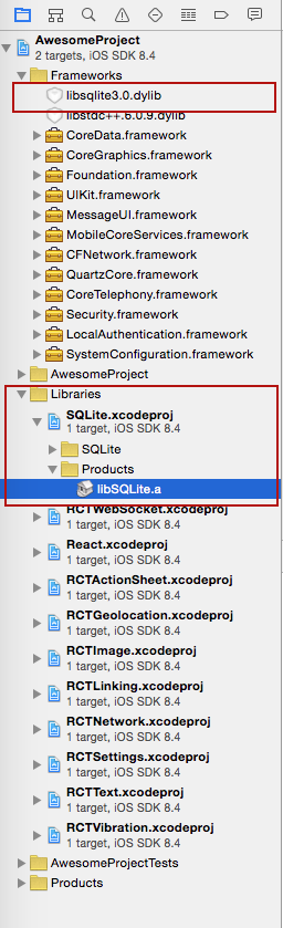 npm install --save react-native-sqlcipher-storageDrag the SQLite Xcode project as a dependency project into your React Native XCode project