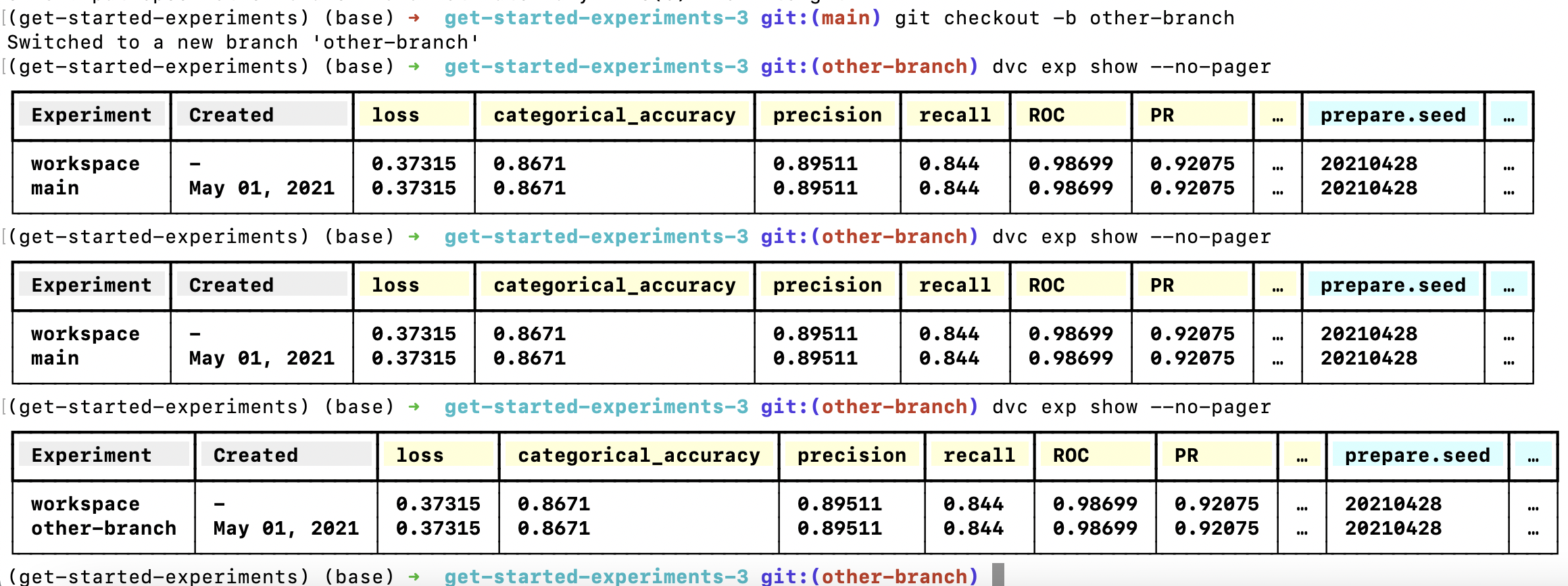 I cloned repo get-started-experiments and created new branch. Now dvc exp show shows me different branch names from time to time. It also happens if you move back to main branch.